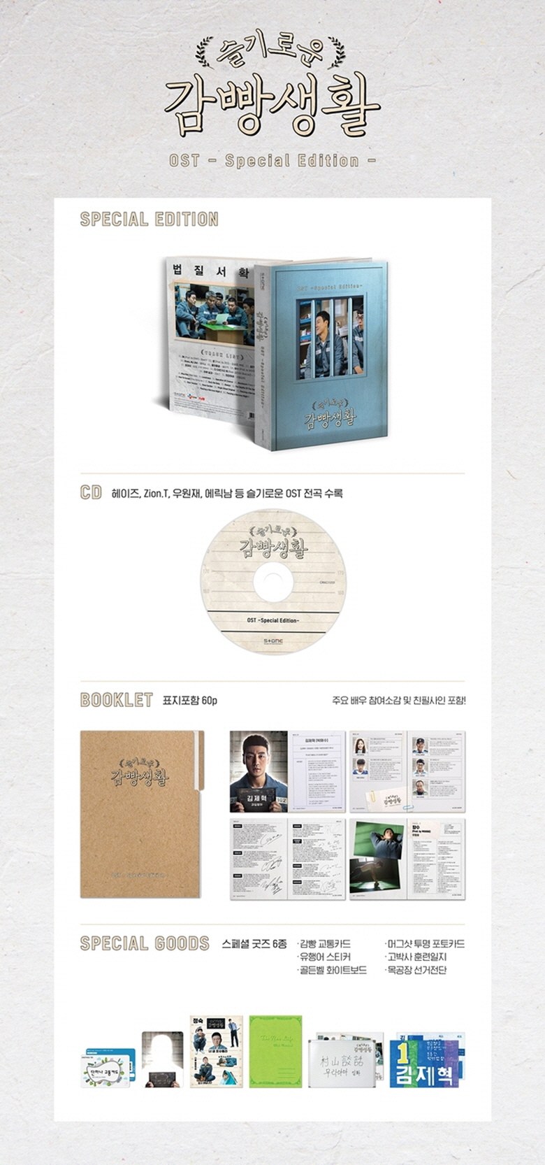 《機智牢房生活》OST特別版專輯,收錄了劇中所有動聽歌曲,讓您隨時重溫劇中的感動。專輯中包含Heize、Zion.T、Eric Nam等多位知名歌手演唱的歌曲,以及主要演員的參與感想與親筆簽名。此外,特別版專輯還附贈多種特別周邊商品,如監獄交通卡、流行語貼紙等,讓您在聆聽音樂的同時,也能感受到《機智牢房生活》的獨特魅力。手冊封面包含60頁,內容豐富,值得珍藏。