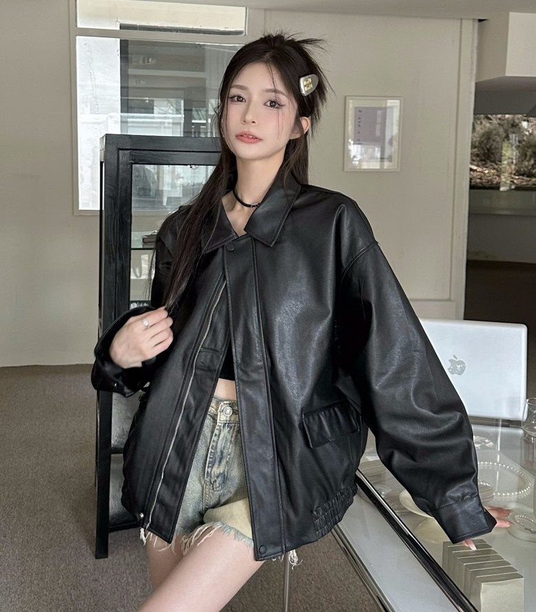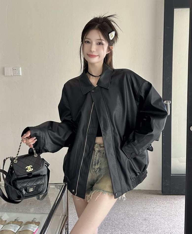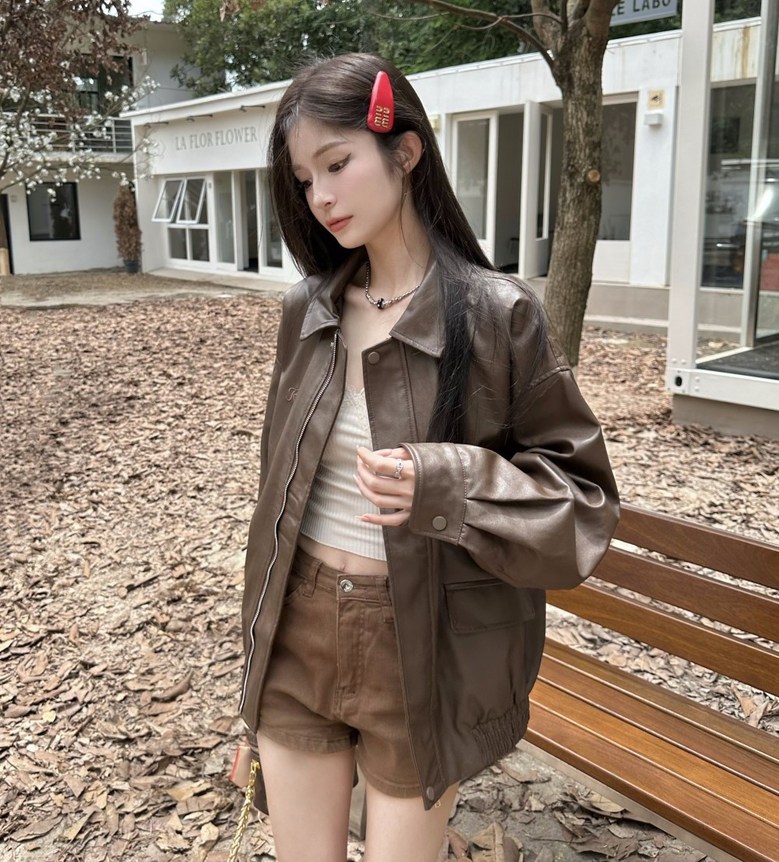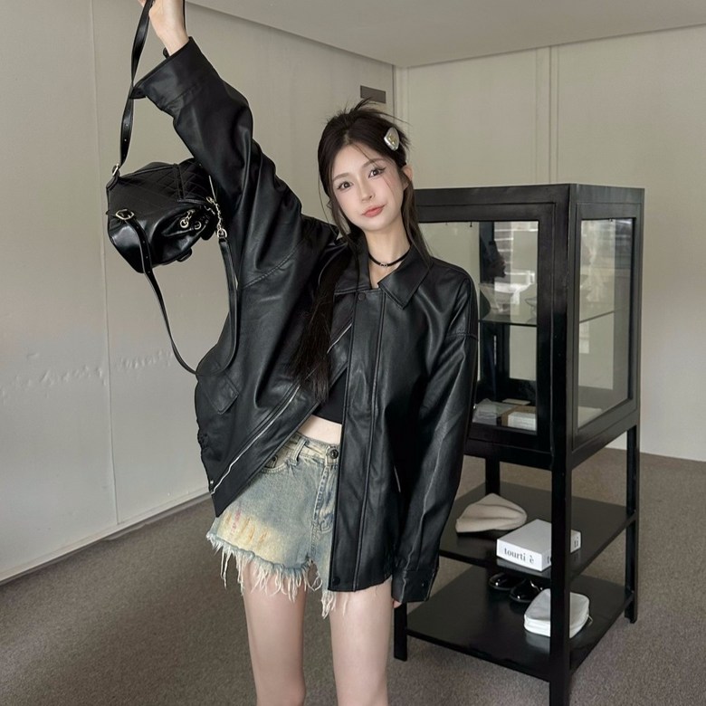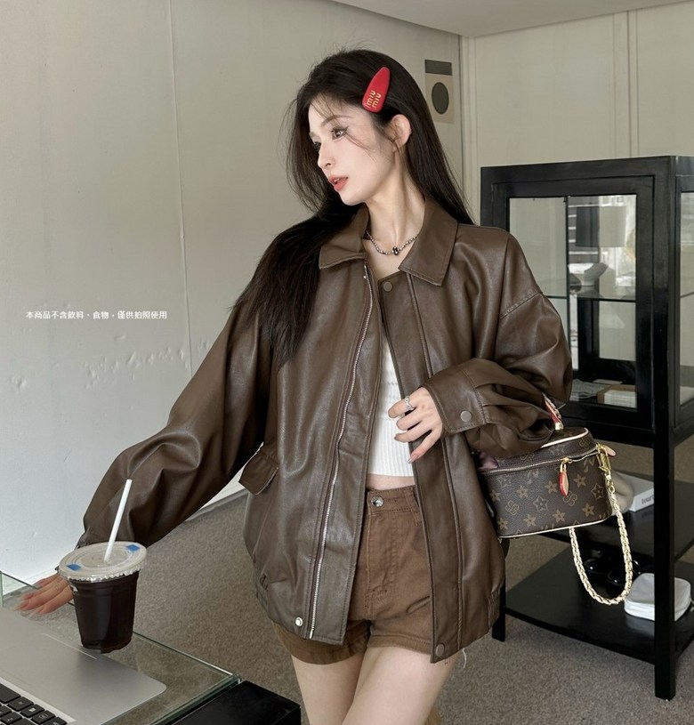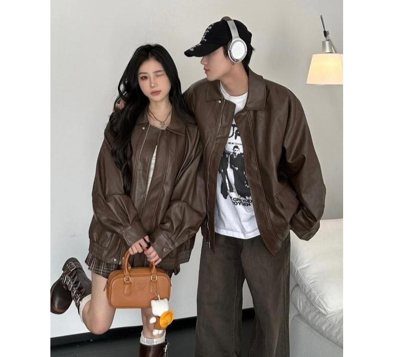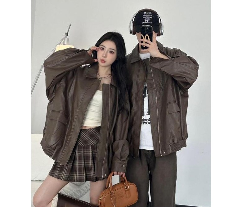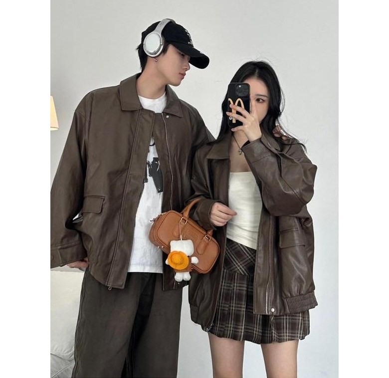 【梨卡】情侶款防風皮衣外套 棕咖色拉鍊皮衣,男女皆宜,現貨速發