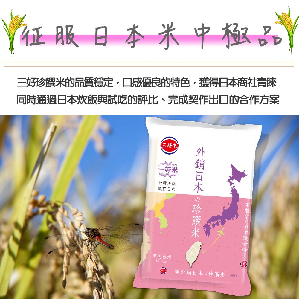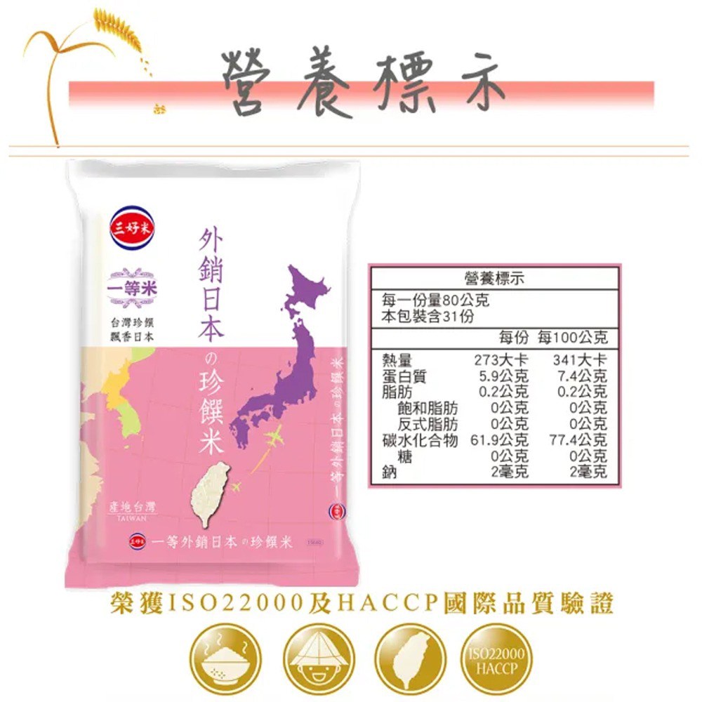 三好米外銷日本珍饌米,嚴選台灣一等米,品質卓越,口感Q彈。此款珍饌米是專為出口日本市場設計的頂級白米,經過嚴格的品質檢驗,符合CNS一等米標準,讓您在家也能品嚐到日本等級的美味。2.5公斤的包裝,適合小家庭或注重米飯品質的您。煮飯時,建議按照包裝上的指示,以適當的比例加水,並浸泡15分鐘,讓米粒充分吸收水分,煮出來的米飯更加香Q可口。無論是搭配日式料理、中式菜餚,或是簡單的白米飯,都能讓您感受到米飯的香甜滋味。