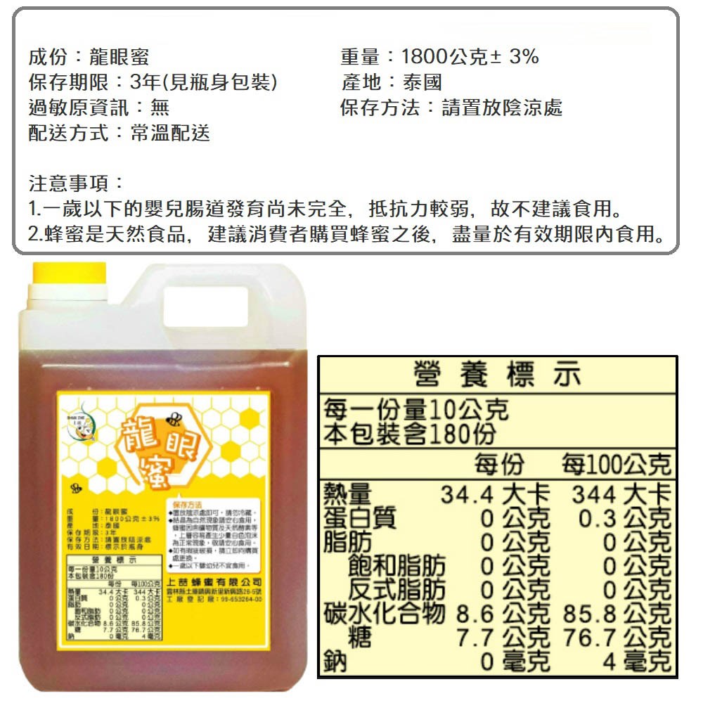 品嚐來自泰國清邁的純正上喆蜂蜜龍眼蜜。龍眼蜜以其獨特的龍眼花香和濃郁的口感而聞名,適合直接食用、沖調飲品或烘焙使用。我們的蜂蜜保證無添加,為您提供健康美味的選擇。無論是搭配早餐、下午茶點心,或是作為禮品贈送親友,上喆蜂蜜龍眼蜜都是您的理想之選。請存放於陰涼處,避免陽光直射,開封後請儘早食用,享受這份來自大自然的甜蜜饋贈。
