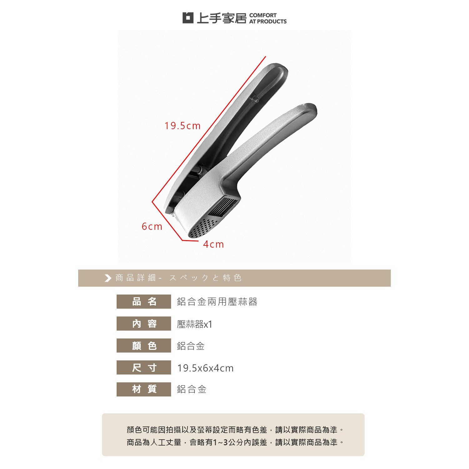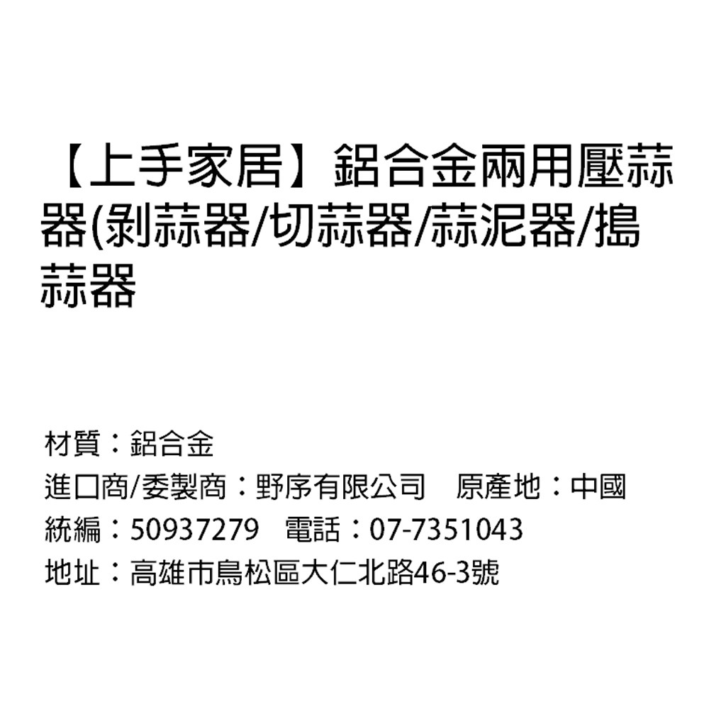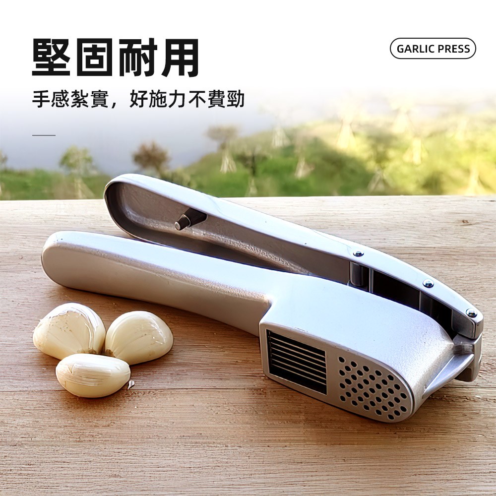 這支鋁合金壓蒜器,結合兩用刀槽,蒜片、蒜泥一次完成。