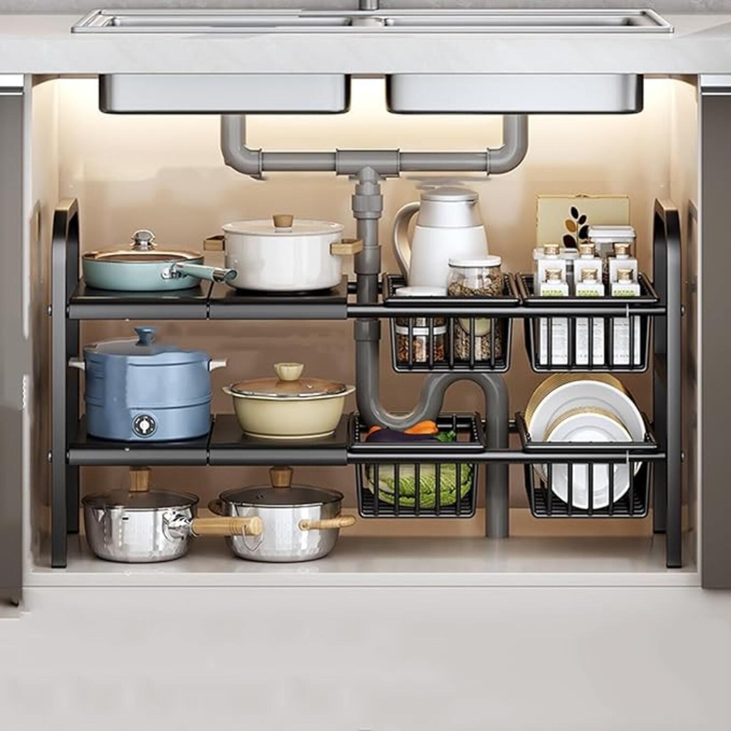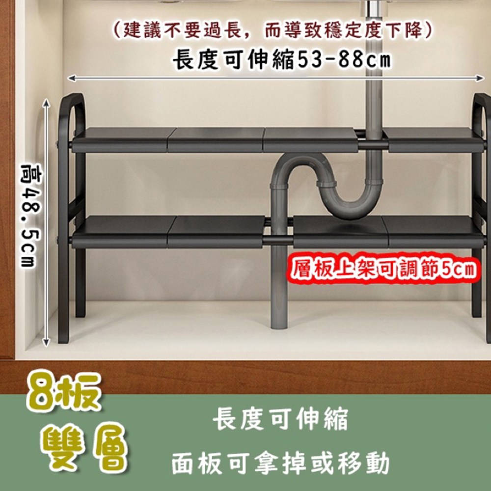 這款下水槽置物架是廚房收納的理想選擇,能有效利用水槽下方的空間,讓廚房更加整潔。雙層設計提供充足的儲物空間,可放置鍋碗瓢盆、清潔用品等。可伸縮的尺寸(48.5 x 53~88cm)設計,能適應不同大小的水槽,安裝簡便。黑色外觀時尚大方,能融入各種廚房風格。採用堅固耐用的材質製成,確保長期使用不變形。讓您的廚房告別雜亂,輕鬆擁有整潔有序的烹飪空間。