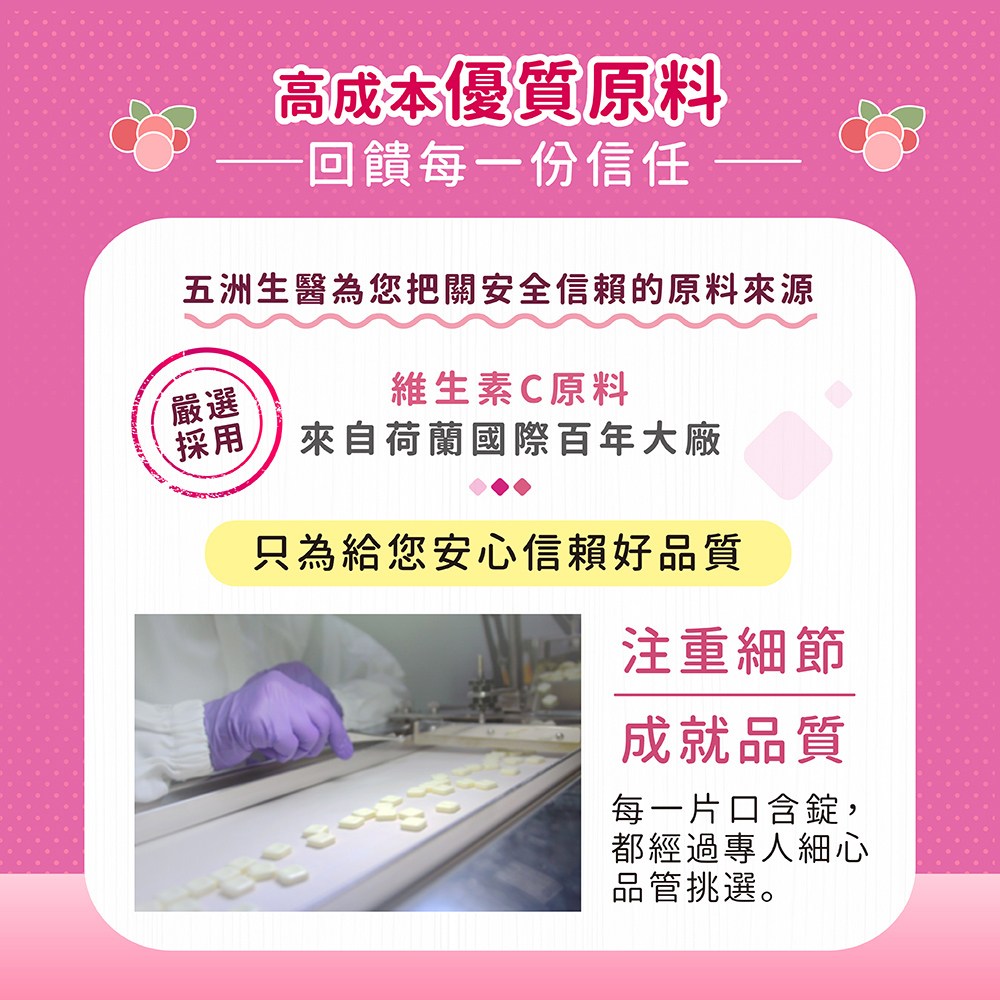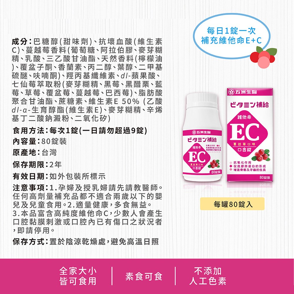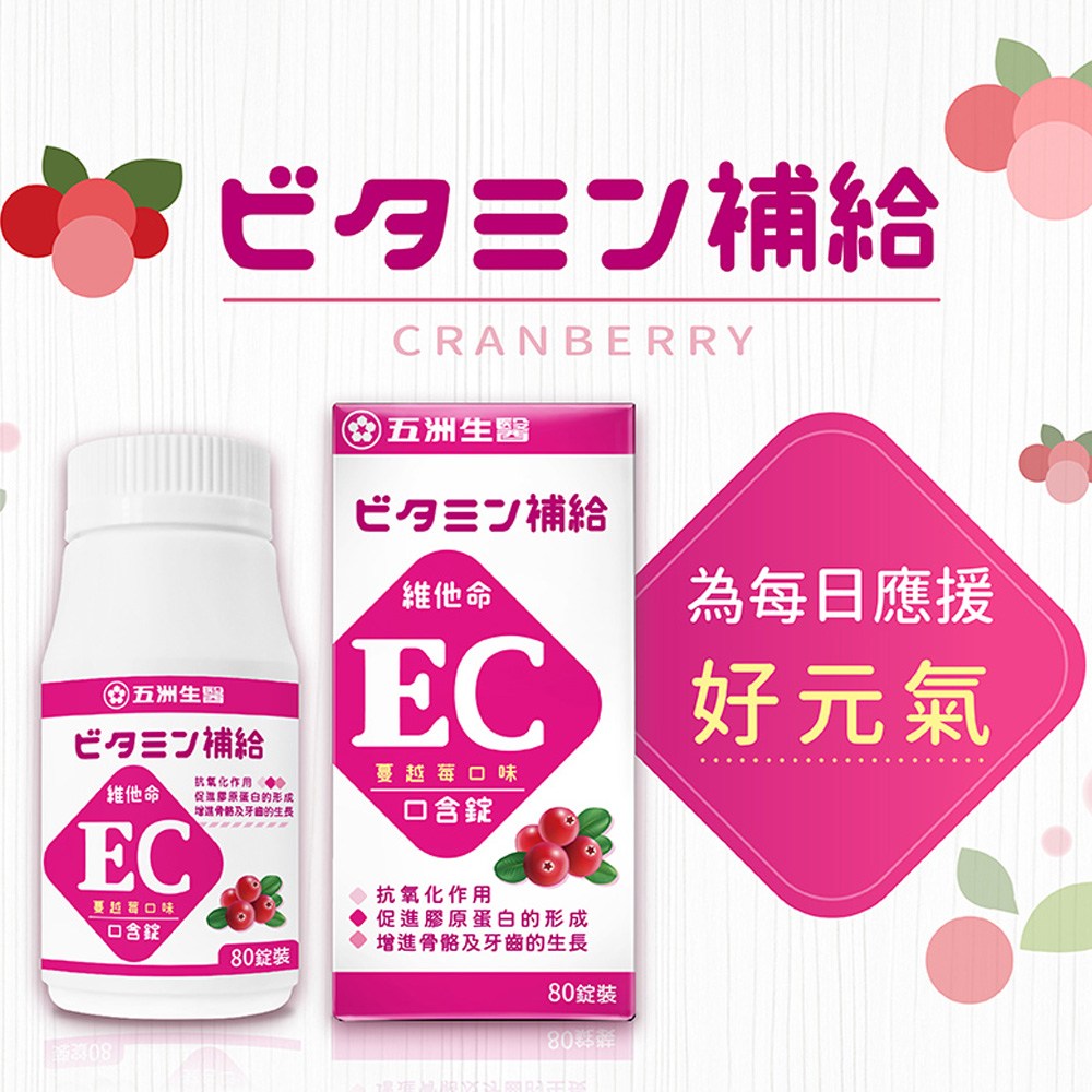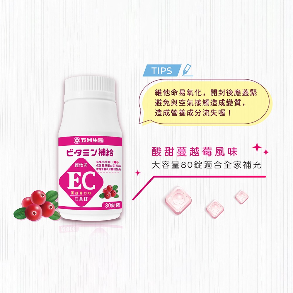 五洲生醫蔓越莓維他命EC口含錠,為您提供每日所需的維生素E和C,每罐80粒,方便隨時補充。這款口含錠採用蔓越莓口味,口感酸甜,大人小孩都喜歡。維生素E有助於減少不飽和脂肪酸的氧化,維生素C則具有抗氧化作用,促進膠原蛋白的形成,並增進體內結締組織、骨骼及牙齒的生長。本產品選用來自荷蘭國際百年大廠的維生素C原料,品質安心可靠。每日一錠,為您的健康加分。