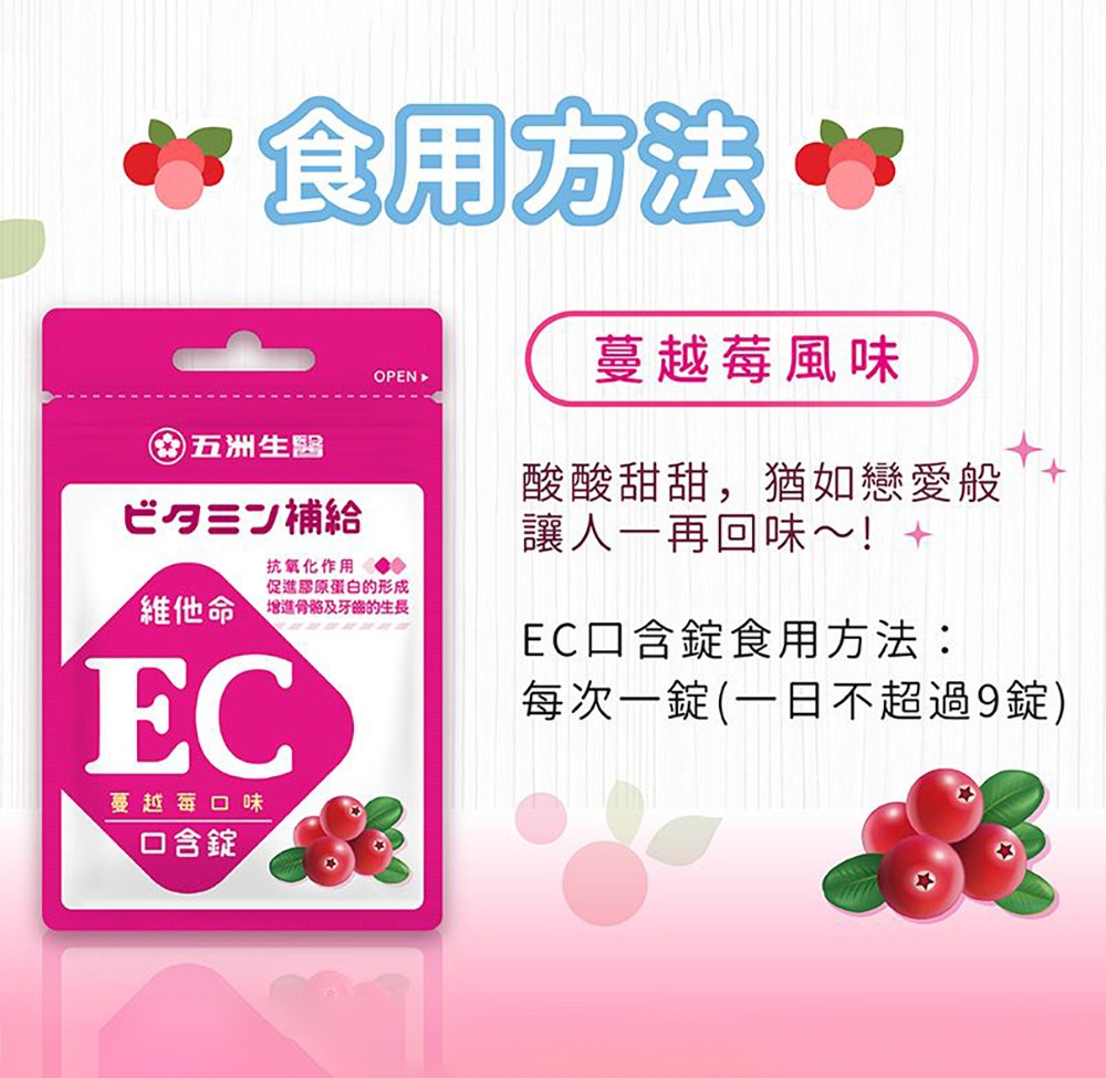 - 酸甜蔓越莓風味口含錠,隨時享受美味,補充維生素C與E,維持健康活力。
