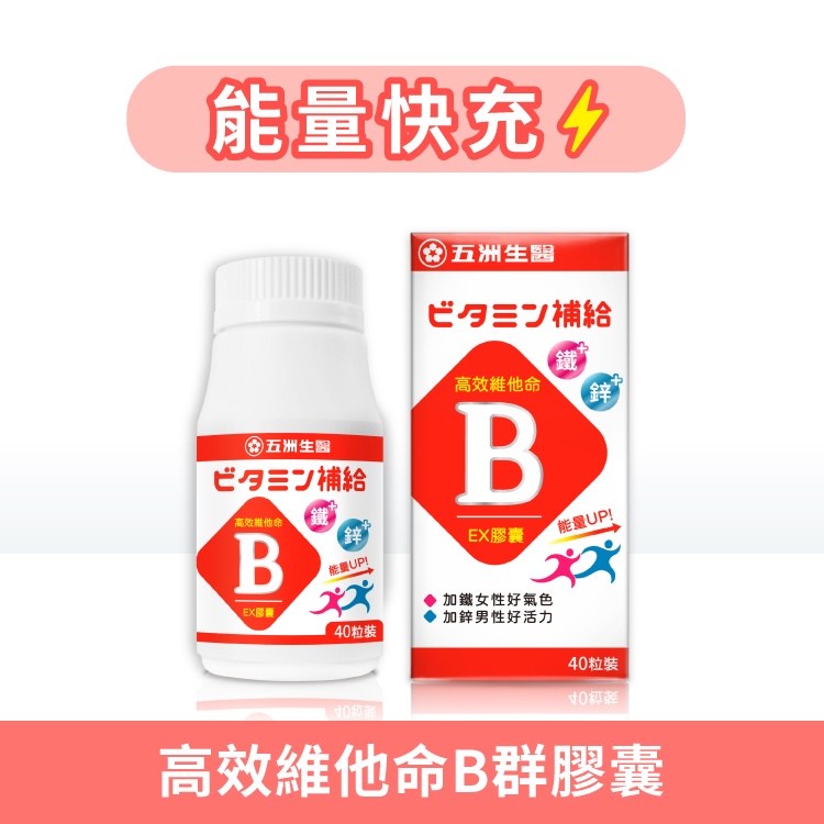 - 五洲生醫B群膠囊,迅速補充每日所需能量,讓您精神飽滿、活力充沛一整天。