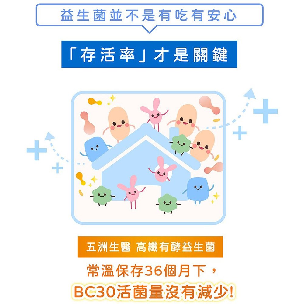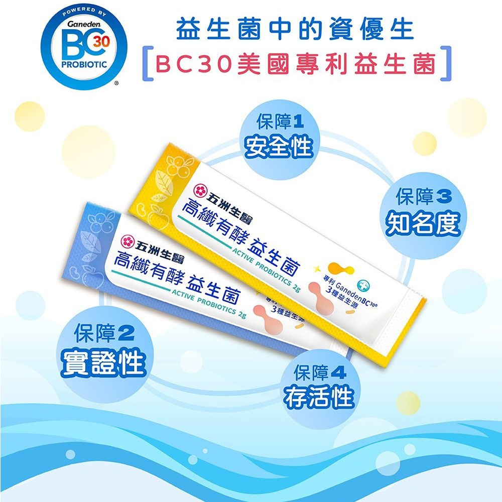 五洲生醫高纖有酵益生菌,每包含有2克益生菌粉末,一盒共30包,藍莓口味,全家大小皆可食用。本產品結合益生元與益生菌,有助於維持消化道機能。特別添加美國專利BC30芽孢乳酸菌,保證每份含有30億活菌,耐酸鹼,穩定性高,無需冷藏,能順利抵達腸道發揮作用。高纖配方,幫助補充膳食纖維,維持腸道健康,讓您天天擁有好氣色。