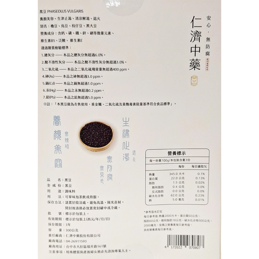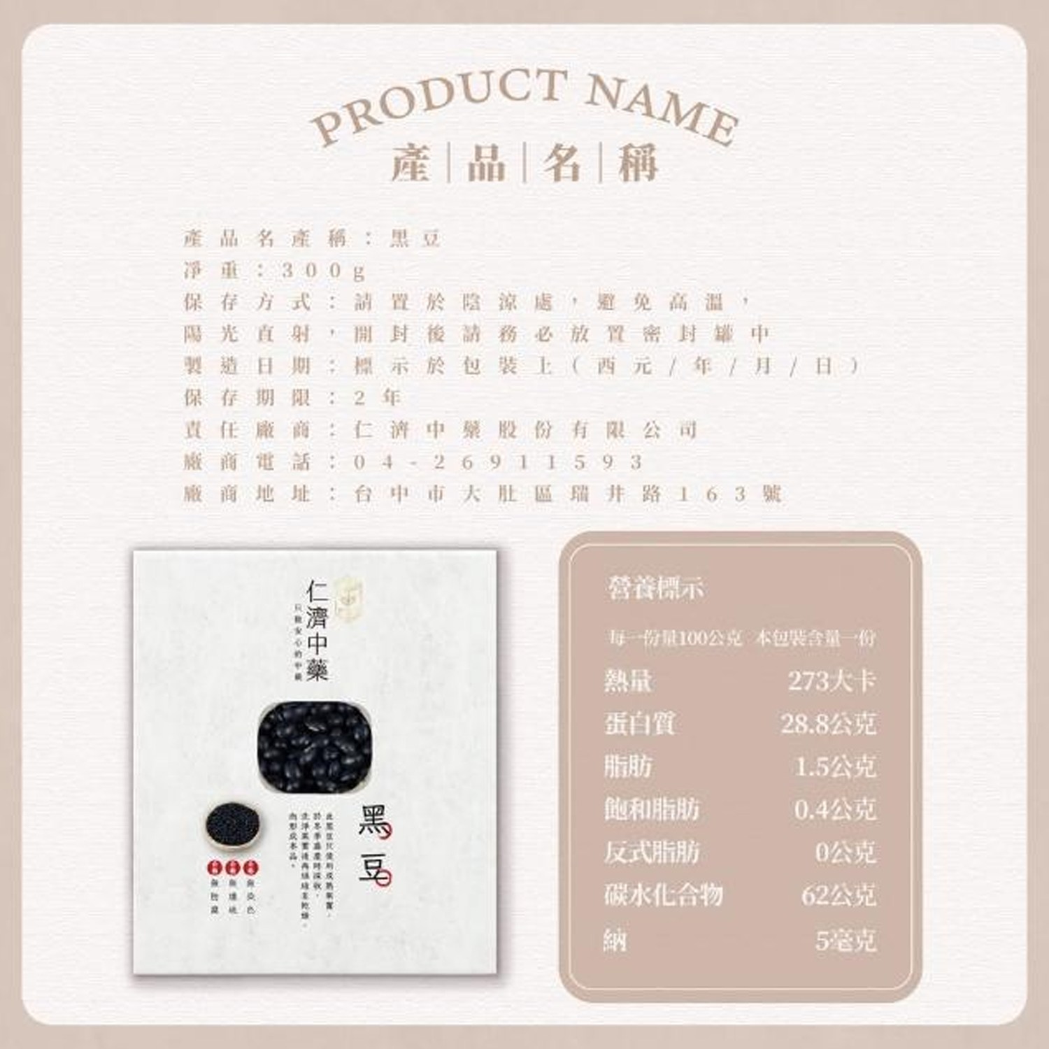 仁濟中藥黑豆,精選上等黑豆,顆粒飽滿,無染色及燻硫,讓您安心食用。每包300g的份量,適合注重養生的您。黑豆富含鈣、磷、鐵、鋅等多種微量元素及維生素。本產品通過嚴格的品質檢驗,確保重金屬、二氧化硫等有害物質含量符合食品標準,讓您吃得安心又健康。無論是泡茶、煮湯或直接食用。