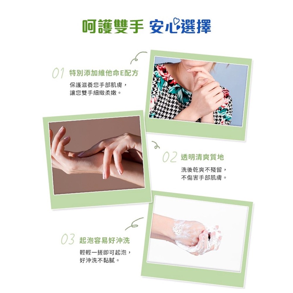 - 溫和洗淨雙手,不刺激肌膚,洗後散發淡淡清香,給您清新舒適的感受。
