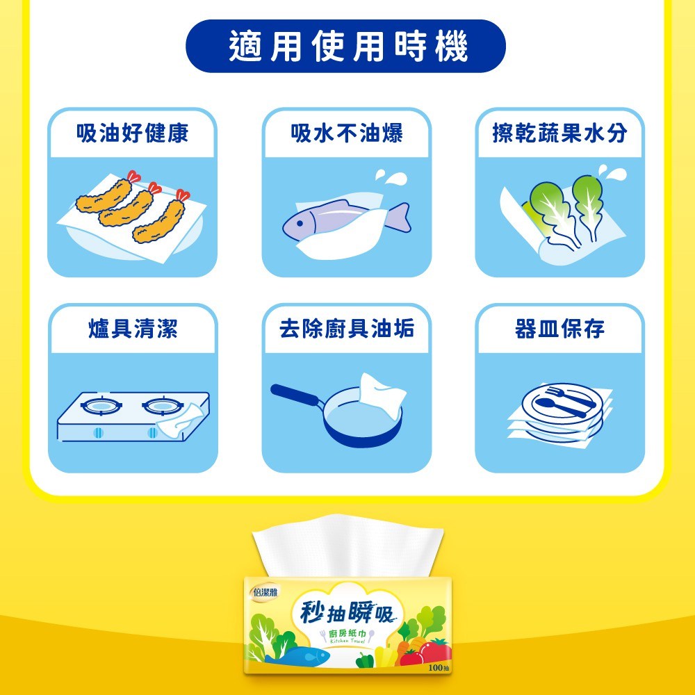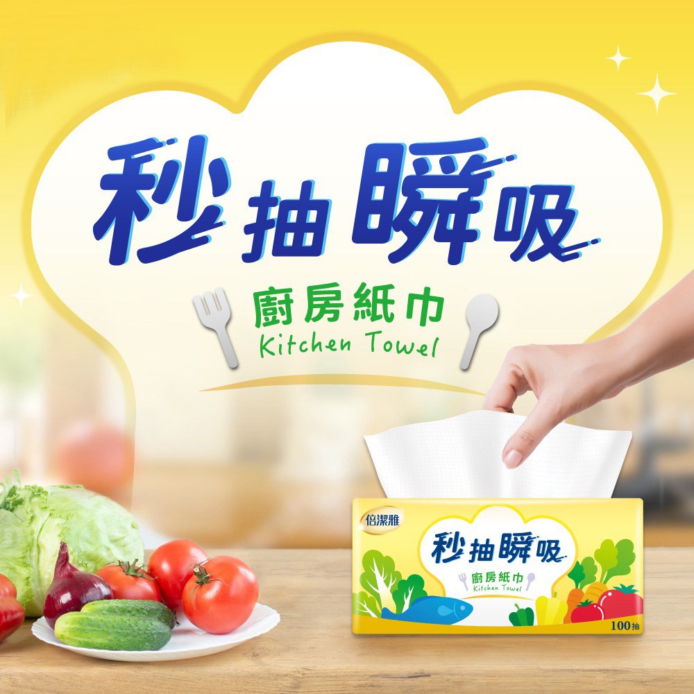 • 倍潔雅廚房紙巾,秒抽瞬吸設計,輕鬆應對廚房各種油水,保持檯面乾淨。