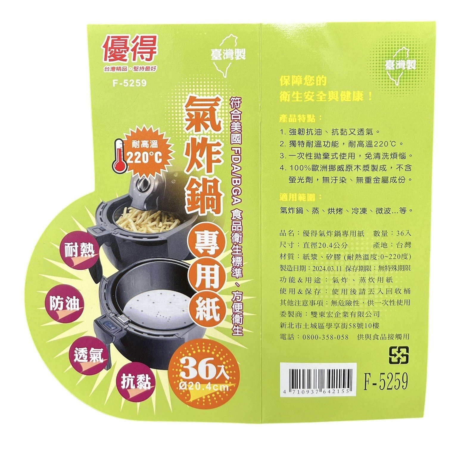 - 優得氣炸鍋用紙具有耐熱特性,在高溫烹飪過程中不易變形,安全可靠,讓您安心使用。