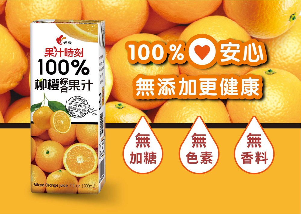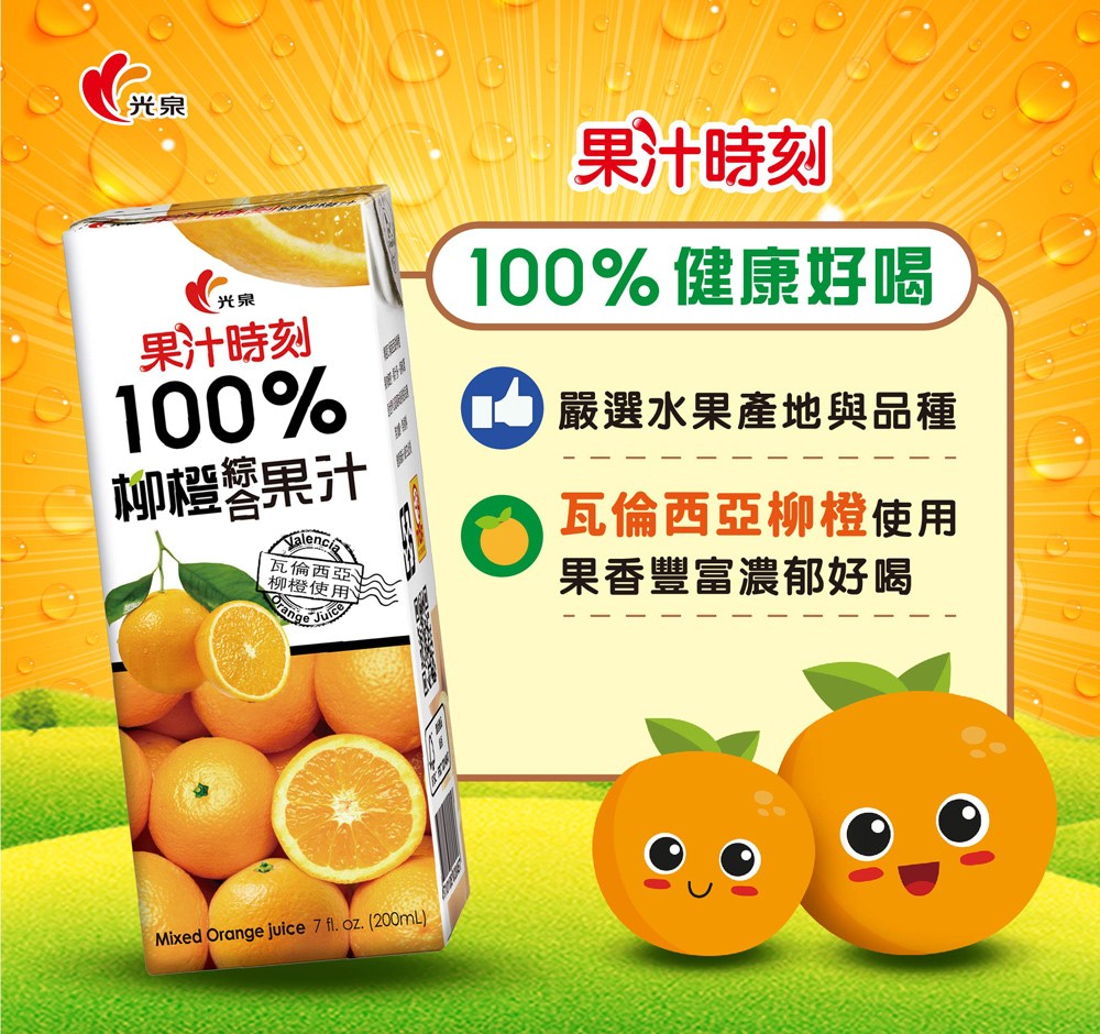 光泉果汁時刻100%柳橙綜合果汁,嚴選瓦倫西亞柳橙。每箱包含24入200ml鋁箔包,方便攜帶與保存,隨時隨地享受新鮮果汁。100%純果汁,無添加糖、色素及香料,讓您安心飲用。無論是早餐、午餐或點心,光泉柳橙汁都是您健康美味的最佳選擇。現在就訂購一箱,為自己和家人補充活力吧!