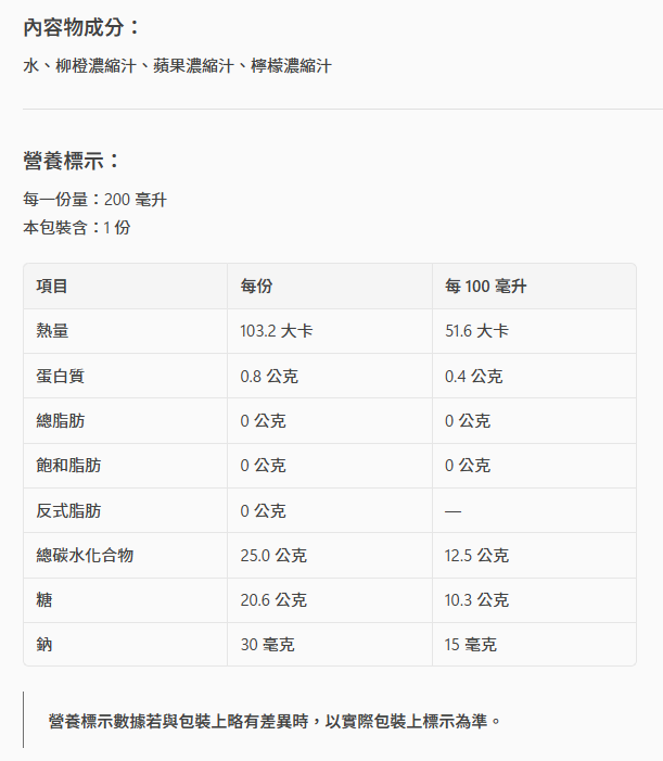 - 百分之百綜合果汁,口感豐富有層次,每一口都喝得到新鮮水果風味。