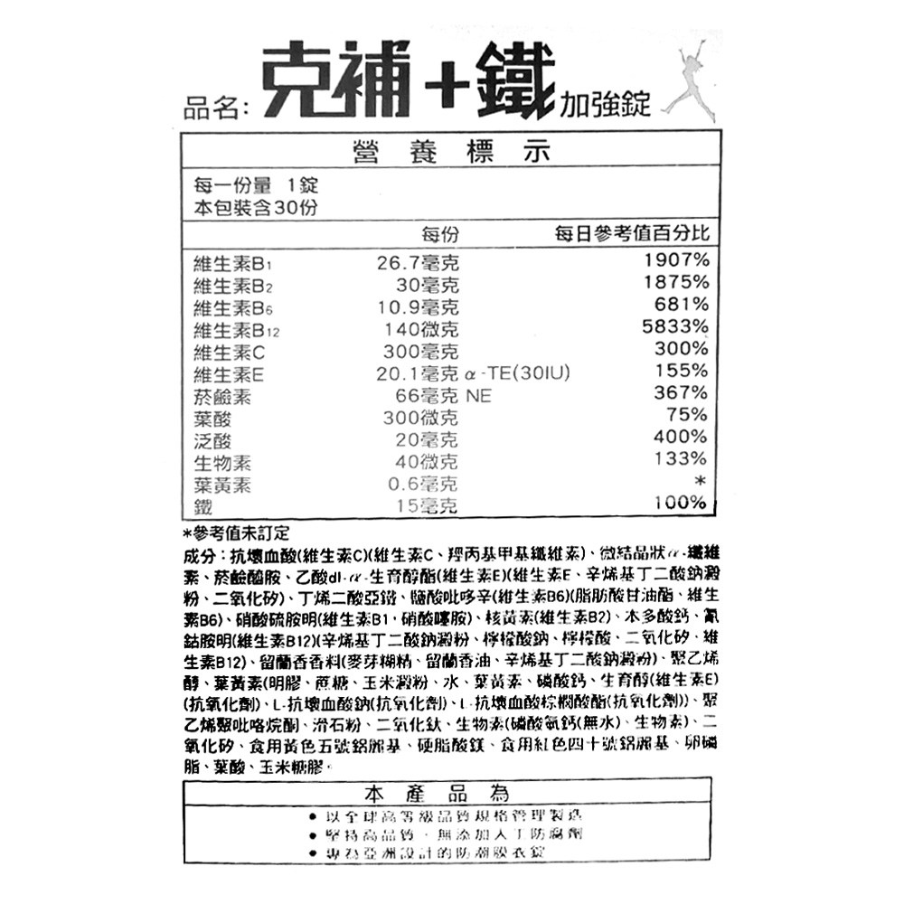 - 克補加鐵加強錠,完整八種B群,增強體力,讓您精神旺盛,告別疲勞,隨時充滿活力。