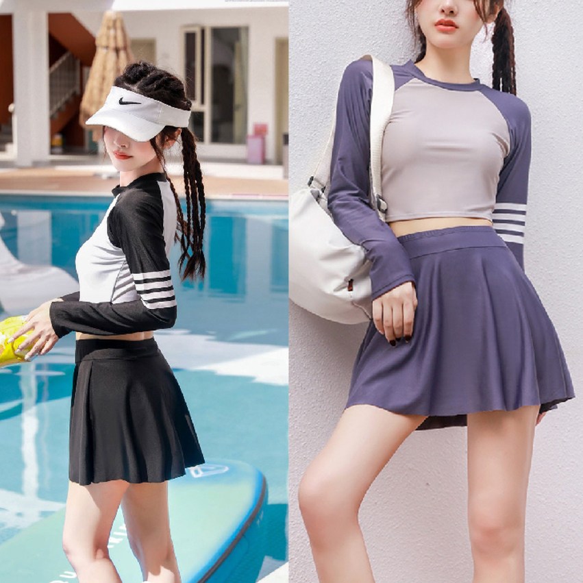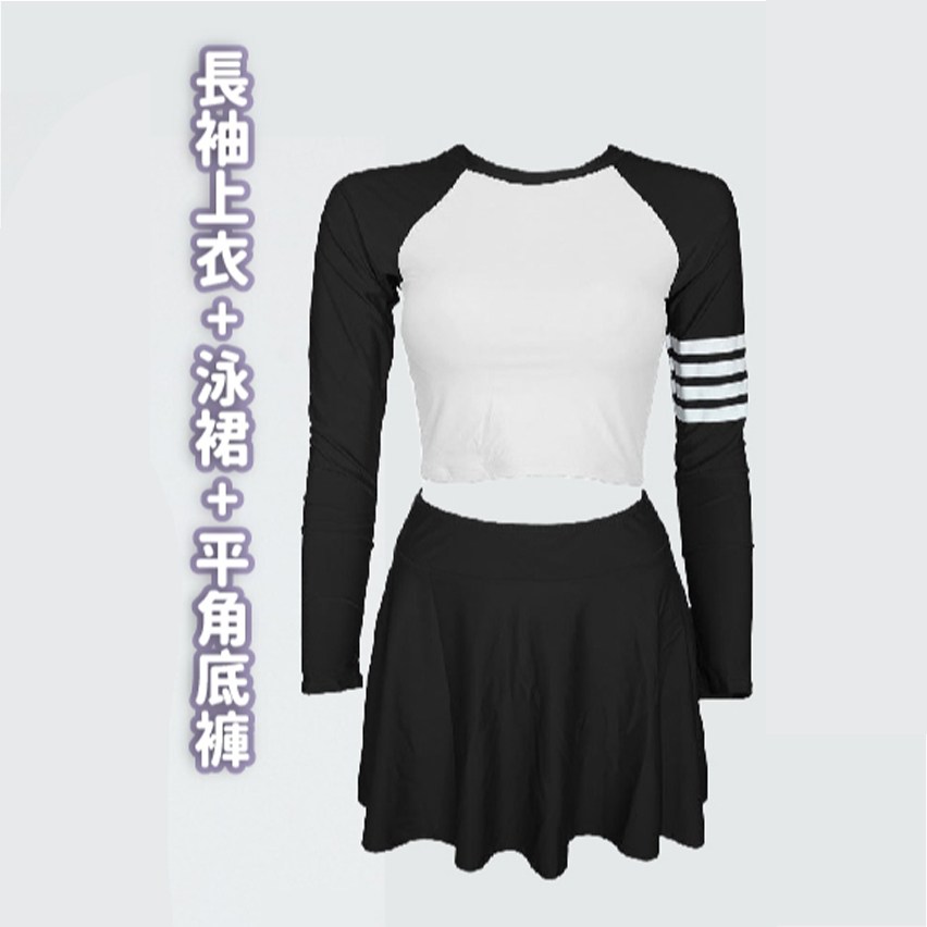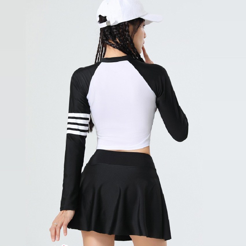 這款女生分體運動泳衣套裝,是您水上運動的時尚之選。長袖設計提供額外的防曬保護,讓您在陽光下盡情享受。黑白撞色的拼接設計,簡約時尚,更顯活力。裙褲套裝不僅方便活動,更增添了女性的優雅氣質。M碼尺寸適合多種身形,拉鍊式閉合方便穿脫。聚酯纖維材質輕盈快乾,讓您在水中也能保持舒適。