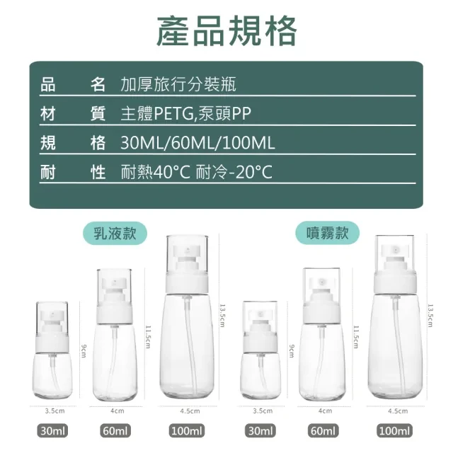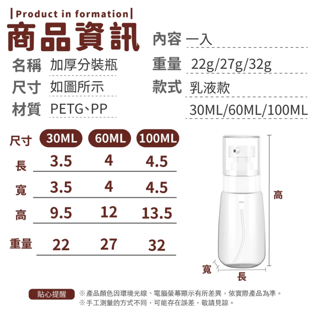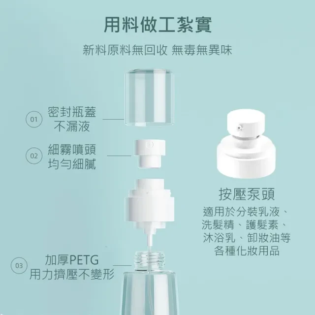 告別瓶罐的沉重負擔!這款加厚分裝乳液瓶,採用堅固耐用的PETG材質,不易變形,讓您安心分裝乳液、化妝水等液體。Y907款式簡約時尚,30ml容量輕巧便攜,一次擁有10個分裝瓶,滿足您旅行、健身、日常等多種需求。按壓式噴頭設計,輕鬆控制用量,避免浪費。雙層密封設計,讓您出行無憂。無論是旅行收納還是日常分裝,這款分裝瓶都是您的理想之選。