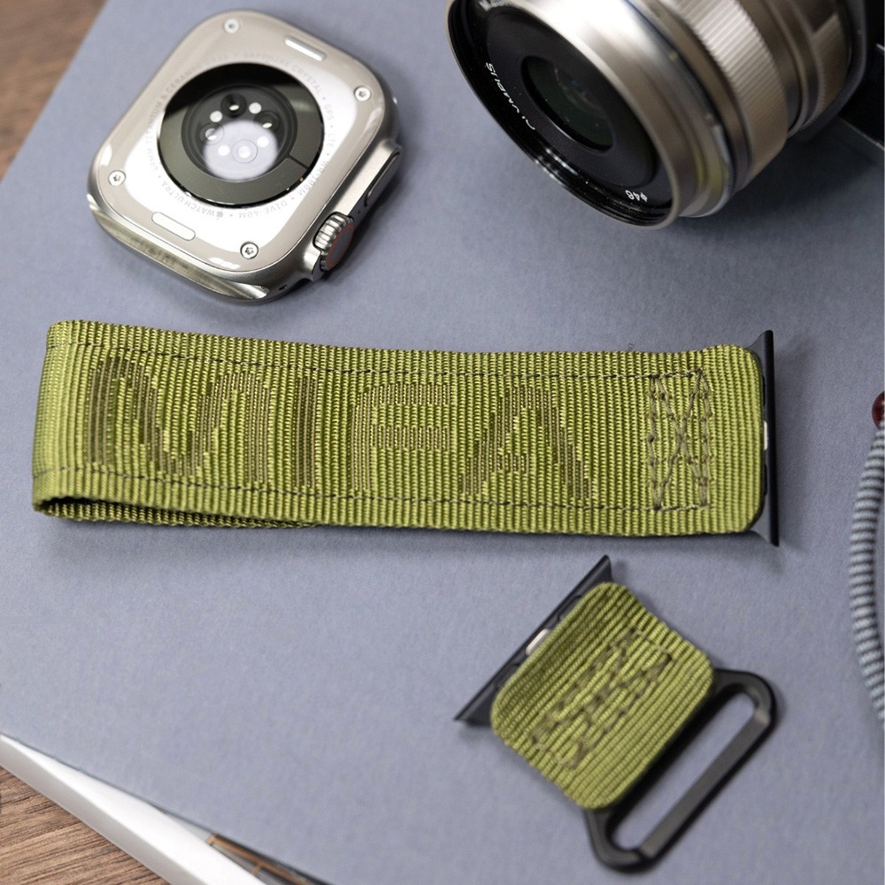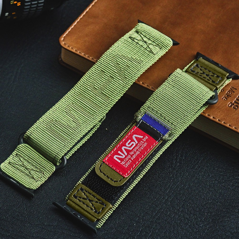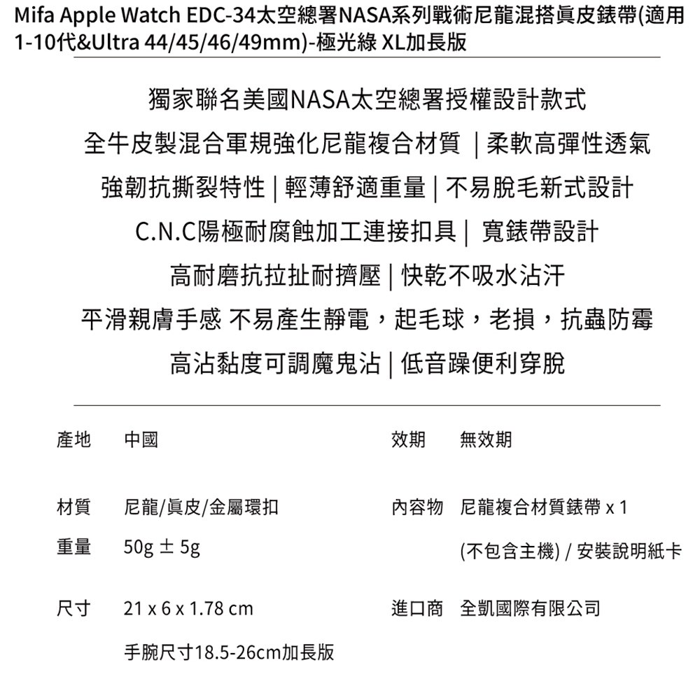 加拿大 Mifa Apple Watch EDC-34太空總署NASA系列戰術尼龍混搭真皮皮革運動錶帶, 極光綠 XL加長版, 1個