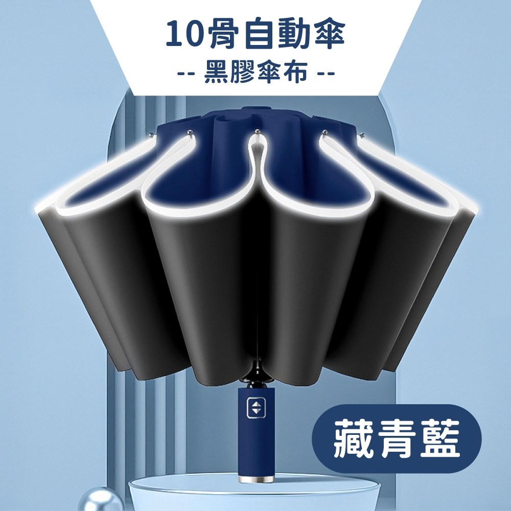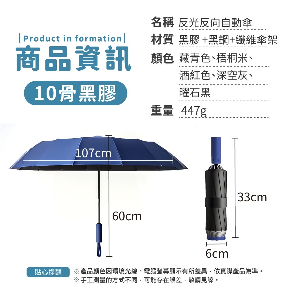 G659 反光反向自動傘,藏青藍色,採用10骨纖維傘架,堅固耐用。展開尺寸為107公分 x 60公分,收納後僅6公分 x 33公分,重量447克,輕巧便攜。具備自動開合功能,一鍵操作,方便快捷。反向傘設計,收傘時雨面朝內,避免弄濕衣物和地面。傘邊緣帶有反光條,夜間出行更安全,提高可見度。晴雨兩用,有效阻擋紫外線,是您雨天和晴天的理想選擇。