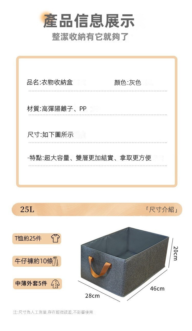 這款可折疊衣物分隔收納箱,是您整理衣物、告別凌亂衣櫃的理想選擇。採用優質布料製成,觸感親膚無異味,讓您安心使用。47 x 28 x 20公分的尺寸,搭配灰色簡約設計,能完美融入各種居家風格。可折疊設計方便收納,不佔空間。一組3個,讓您輕鬆分類整理不同衣物,告別翻箱倒櫃的煩惱,讓您的衣櫃煥然一新。