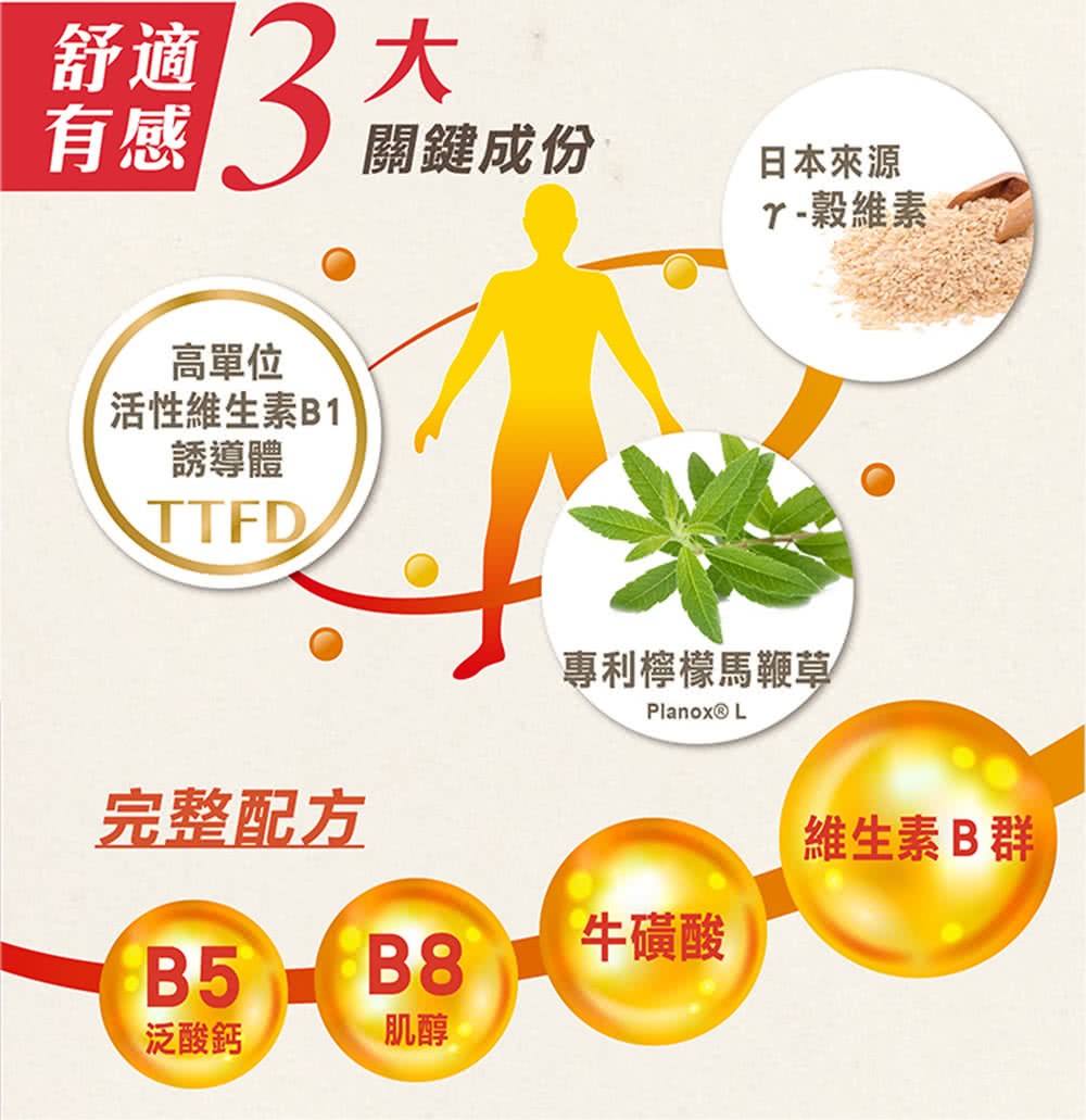 - 特別添加活性維生素B1誘導體TTFD,轉化為活性B1,不易被酵素破壞,提供更佳的能量轉換效果。
