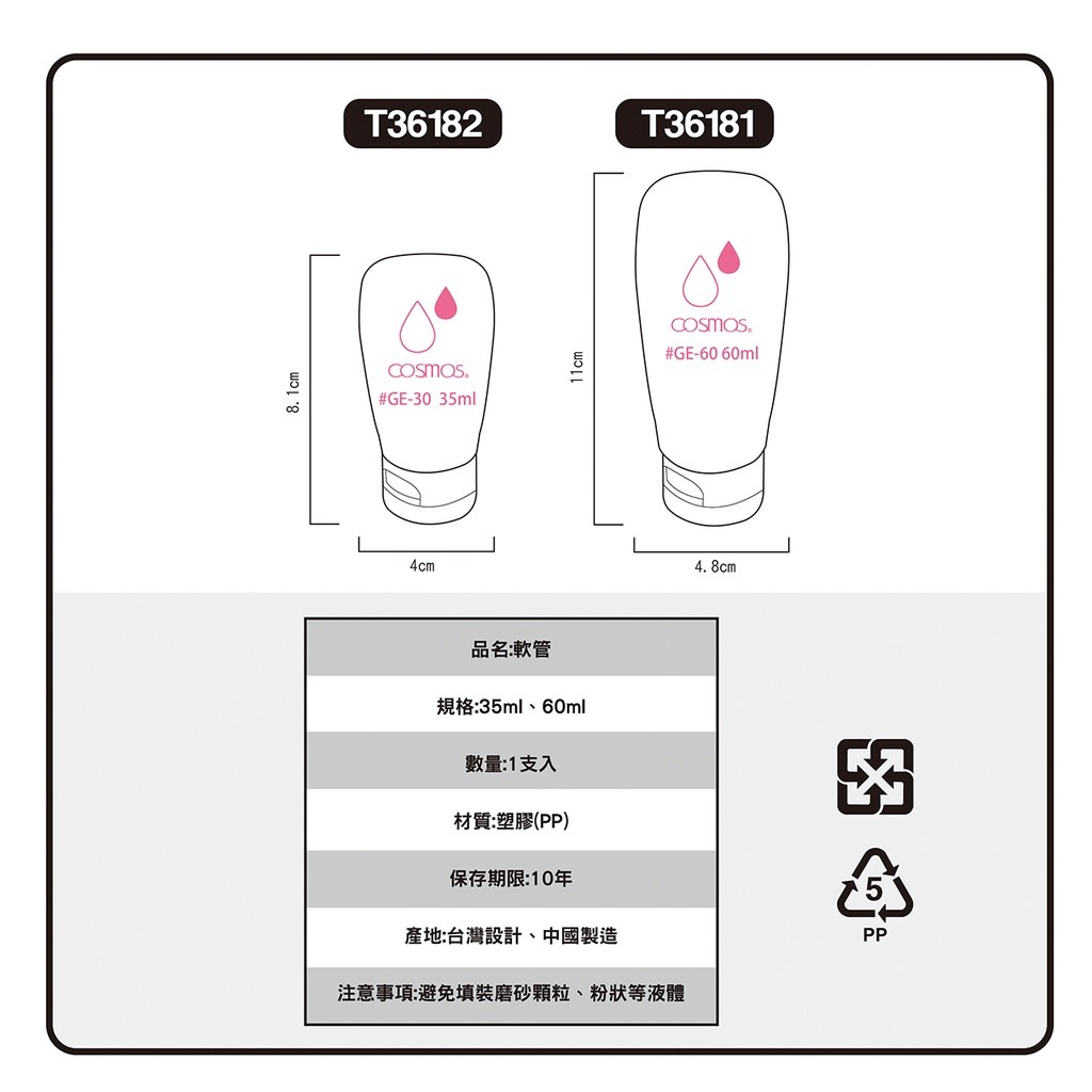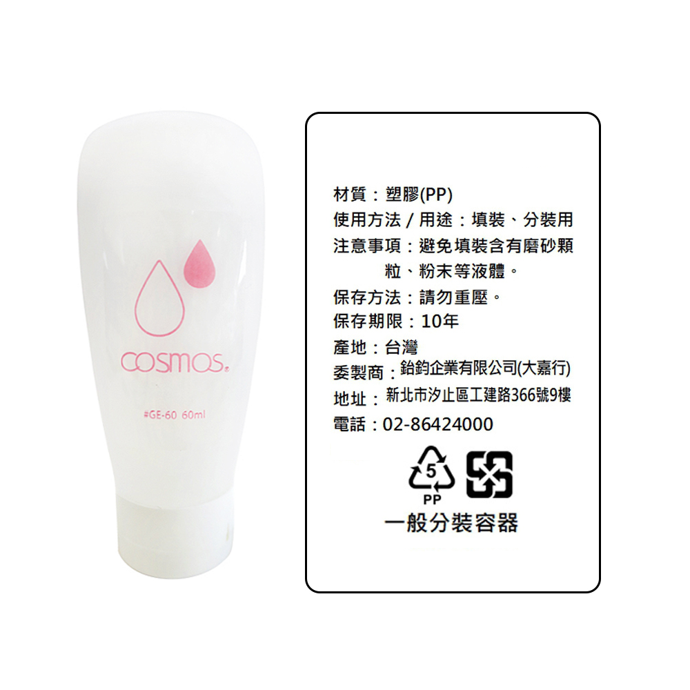 這款COSMOS 60ml霧面白軟管,是您旅行或日常分裝保養品、化妝品及其他液體的理想選擇。採用優質PP材質製成,讓您安心使用。霧面白設計簡約時尚,60ml容量輕巧便攜,方便您隨時隨地補充所需。無論是旅行收納或居家整理。請注意,避免分裝含有磨砂顆粒、粉末等液體。