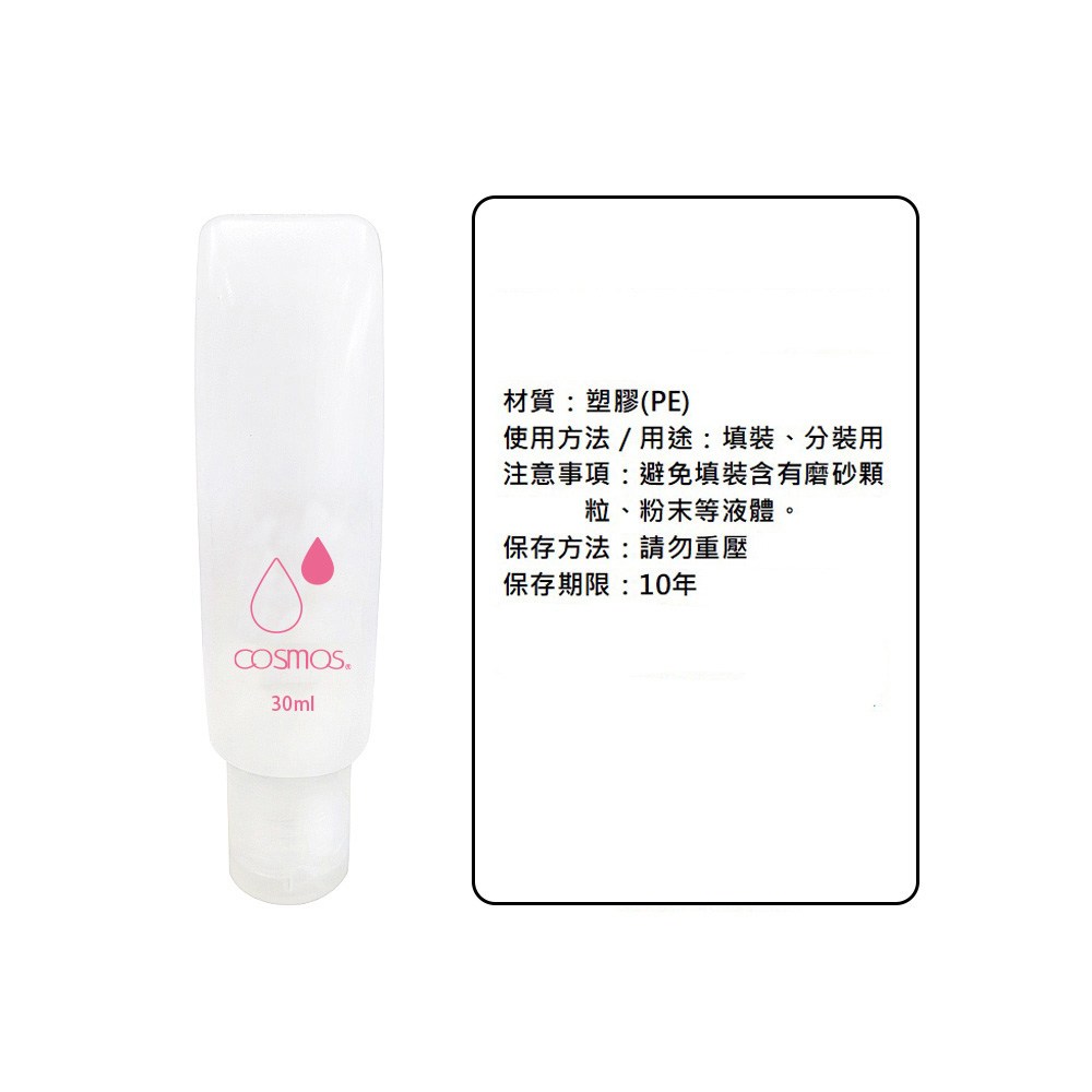 台灣 COSMOS B1 軟管分裝瓶是您旅行或日常使用的理想選擇。這款30ml透明軟管由塑膠(PE)製成,輕巧耐用,方便攜帶。軟管設計讓您輕鬆控制擠出量,避免浪費。無論是分裝洗髮精、沐浴乳或洗面乳,都能輕鬆搞定,讓您的生活更加便利!