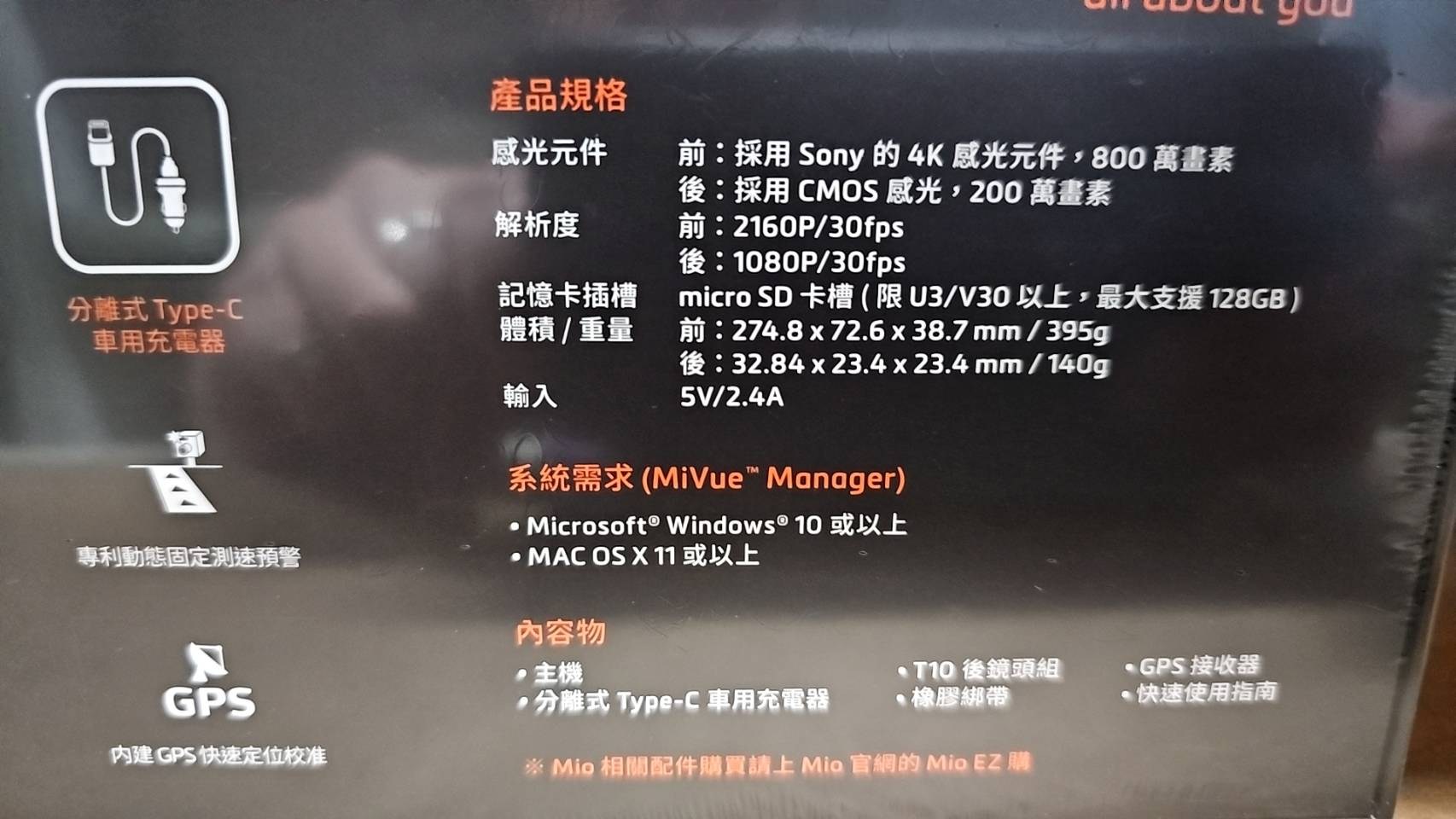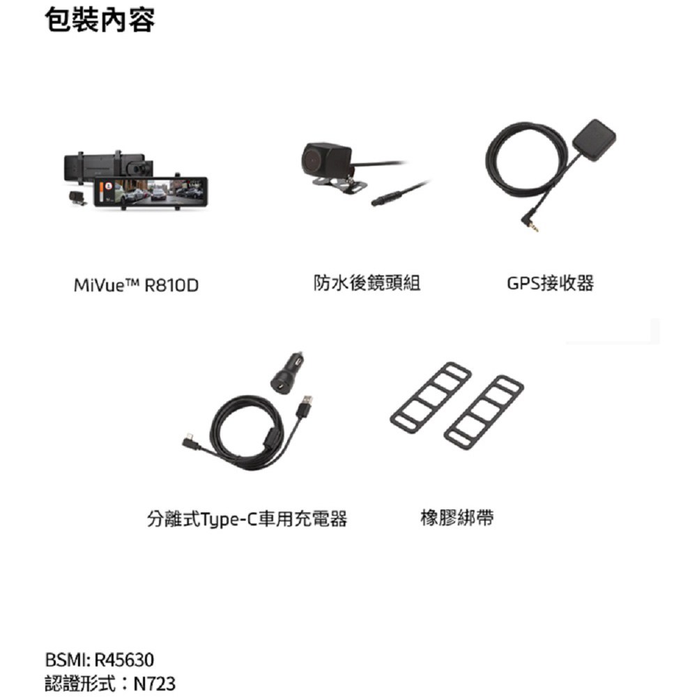 台灣 MiO MiVue 後視鏡型前後雙鏡GPS行車記錄器 前4K + 後1080p 附64G記憶卡 R810D, 防水後鏡頭組 + GPS接收器 + 分離式Type-C車用充電器 + 橡膠綁帶