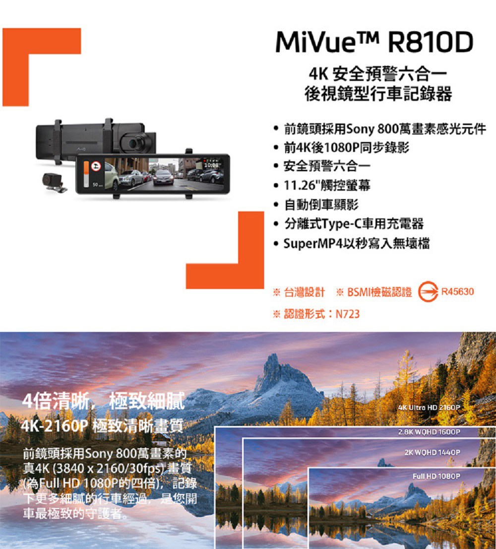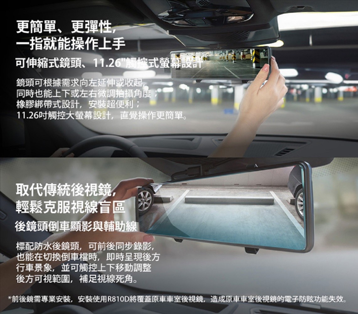 MiVue R810D後視鏡型行車記錄器,結合了前後雙鏡頭同步錄影功能,前鏡頭4K超高解析度搭配後鏡頭1080p,清晰記錄行車過程。內建安全預警六合一,提供全方位的測速與科技執法預警,是您行車安全的最佳守護者。11.26吋觸控螢幕操作簡單直覺,取代傳統後視鏡,輕鬆克服視線盲區。此外,分離式Type-C車用充電器設計,安裝更彈性便利。具備倒車顯影功能,讓您停車更加安全。