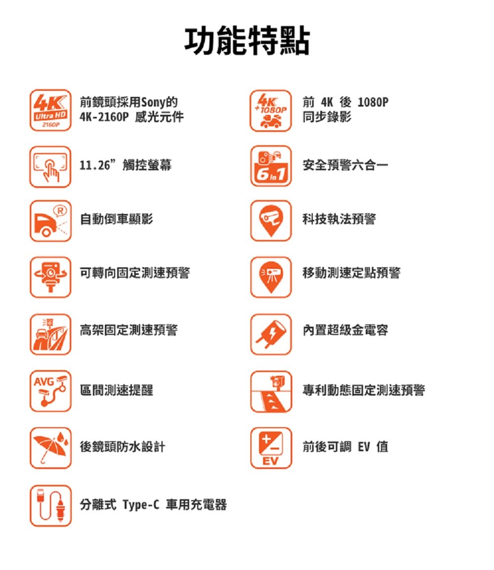 - 採用Sony感光元件,前鏡頭提供清晰4K畫質,讓您記錄每個細節,確保行車安全無虞。