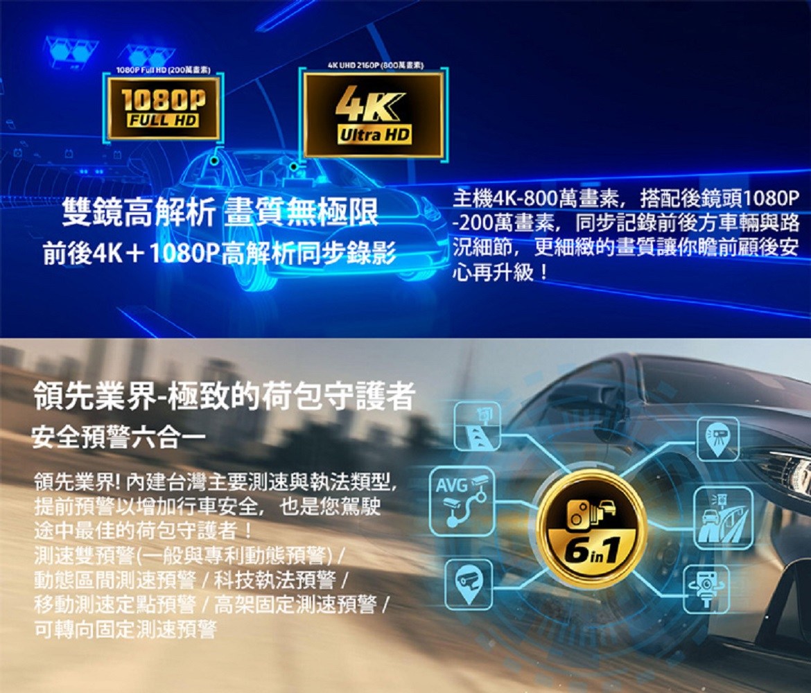 - 內建安全預警六合一功能,提供多種測速預警,讓您在駕駛途中安心,避免超速罰單。