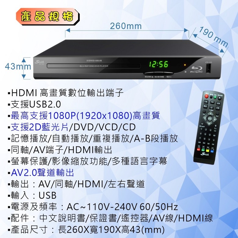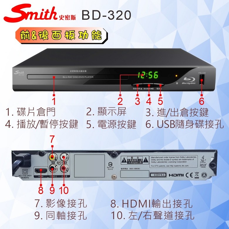史密斯 BD-320 藍光播放機 支援USB/HDMI 1080P高畫質
