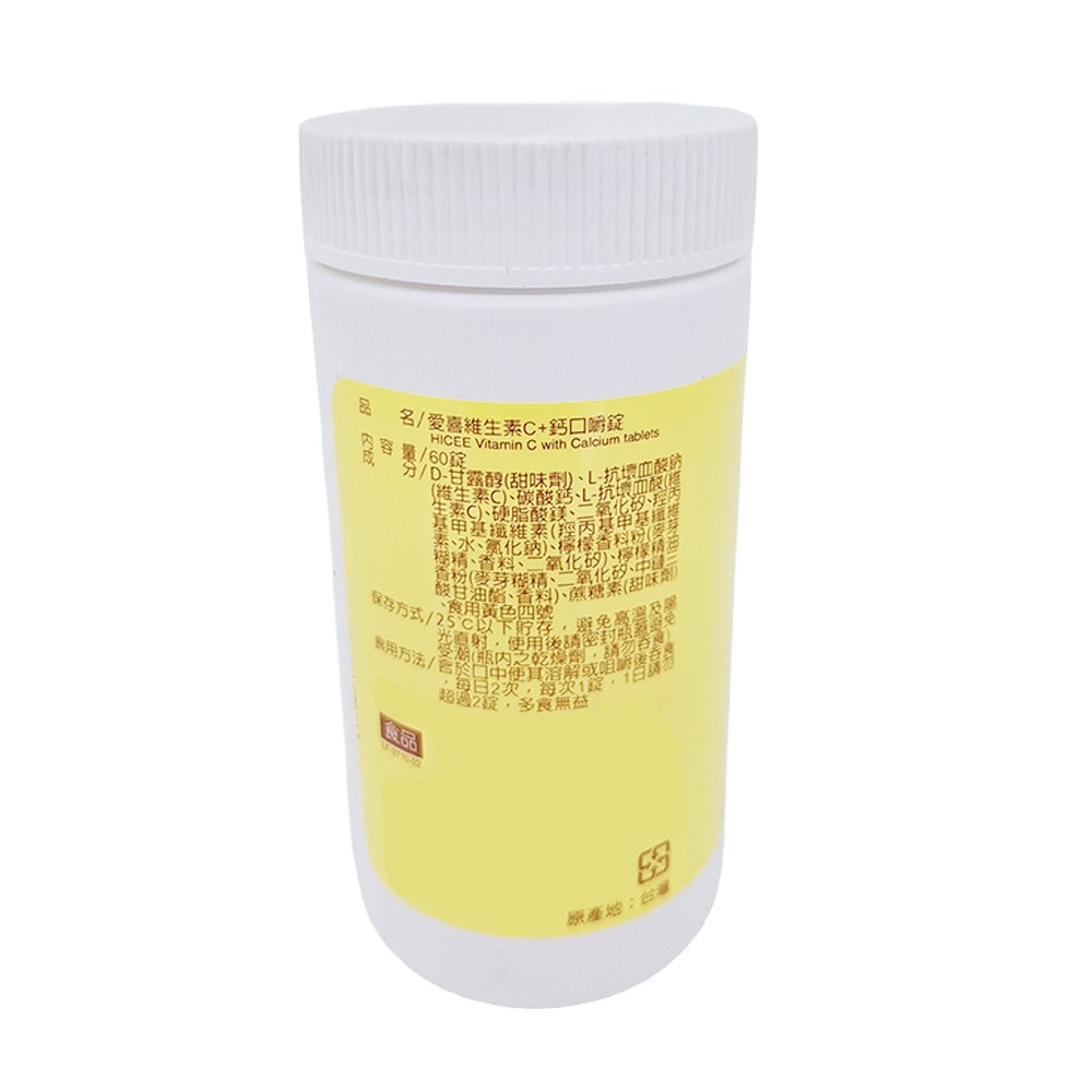 合力他命 HICEE 愛喜維生素C+鈣口嚼錠,讓您隨時隨地補充每日所需的維生素C。每顆口嚼錠含有500毫克維生素C,並添加鈣質,有助於提升保護力,同時補充鈣質,維持骨骼健康。清新檸檬口味,口感佳,大人小孩都喜歡。每盒60顆,方便攜帶,隨時隨地享受美味又健康的維生素C。無論在家中、辦公室或旅途中,愛喜維生素C口嚼錠都是您維持健康的理想選擇。