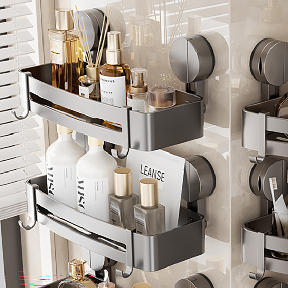 這款吸盤浴室置物架是您浴室收納的理想選擇。免釘免鑽的設計,讓您輕鬆安裝,不損壞牆面。四方造型簡約時尚,灰色外觀低調有質感,能有效利用浴室空間,整潔有序。置物架可放置洗髮精、沐浴乳等,方便拿取,附帶掛勾設計,可懸掛毛巾、刷具等,增加收納功能。鏤空瀝水設計,保持乾燥,不易滋生細菌,衛生清潔,讓您使用更安心。
