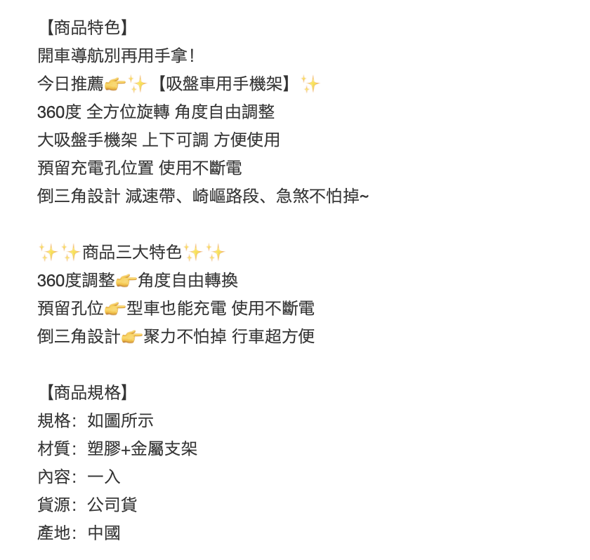 這款吸盤車用手機架(Y135)是您行車導航的最佳夥伴,讓您告別手持導航的危險。360度全方位旋轉設計,角度自由調整,無論是儀表板或擋風玻璃,都能穩固吸附。預留充電孔位,讓您的手機隨時保持電力充沛,導航不斷電。倒三角設計,有效應對減速帶和崎嶇路段,確保手機穩固不掉落。每組包含兩個手機架,重量僅141克,輕巧不佔空間,讓您輕鬆享受安全便捷的駕駛體驗。