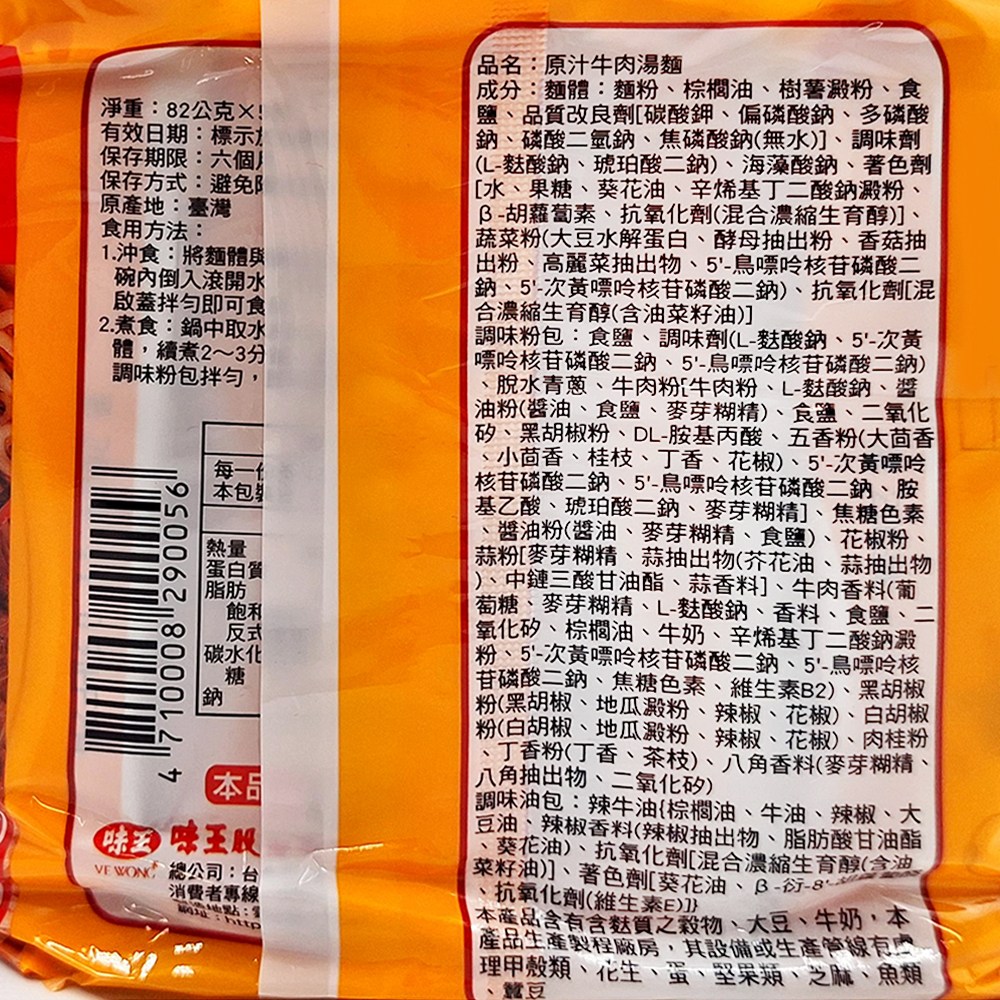 味王原汁牛肉湯麵,是台灣經典的國民美食,採用傳統配方,湯頭濃郁,牛肉味十足,麵條Q彈有嚼勁。每包含有5包麵,每包82克,份量十足,無論是正餐或宵夜,都能滿足您的味蕾。採用袋裝包裝,方便儲存和攜帶,讓您隨時隨地都能享受到美味的牛肉麵。本產品絕不添加防腐劑,讓您吃得安心又健康。