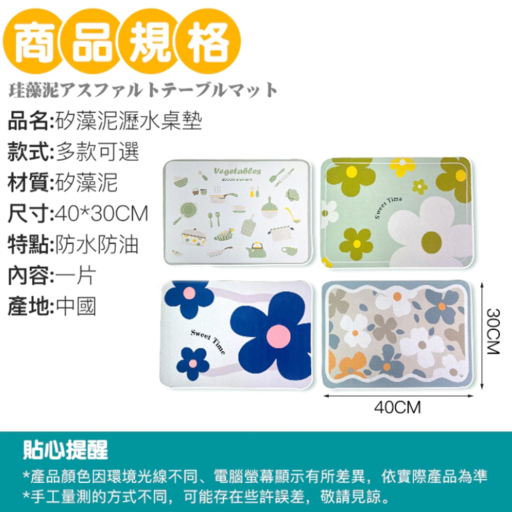 - 30x40公分尺寸適中,不佔空間,輕鬆放置餐具、杯具,為您的桌面增添色彩。