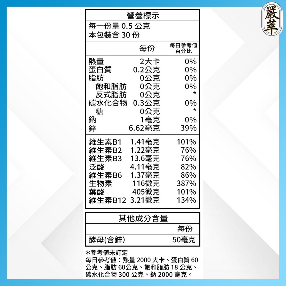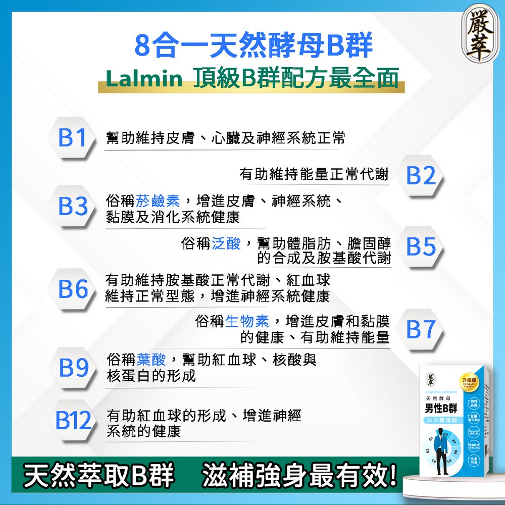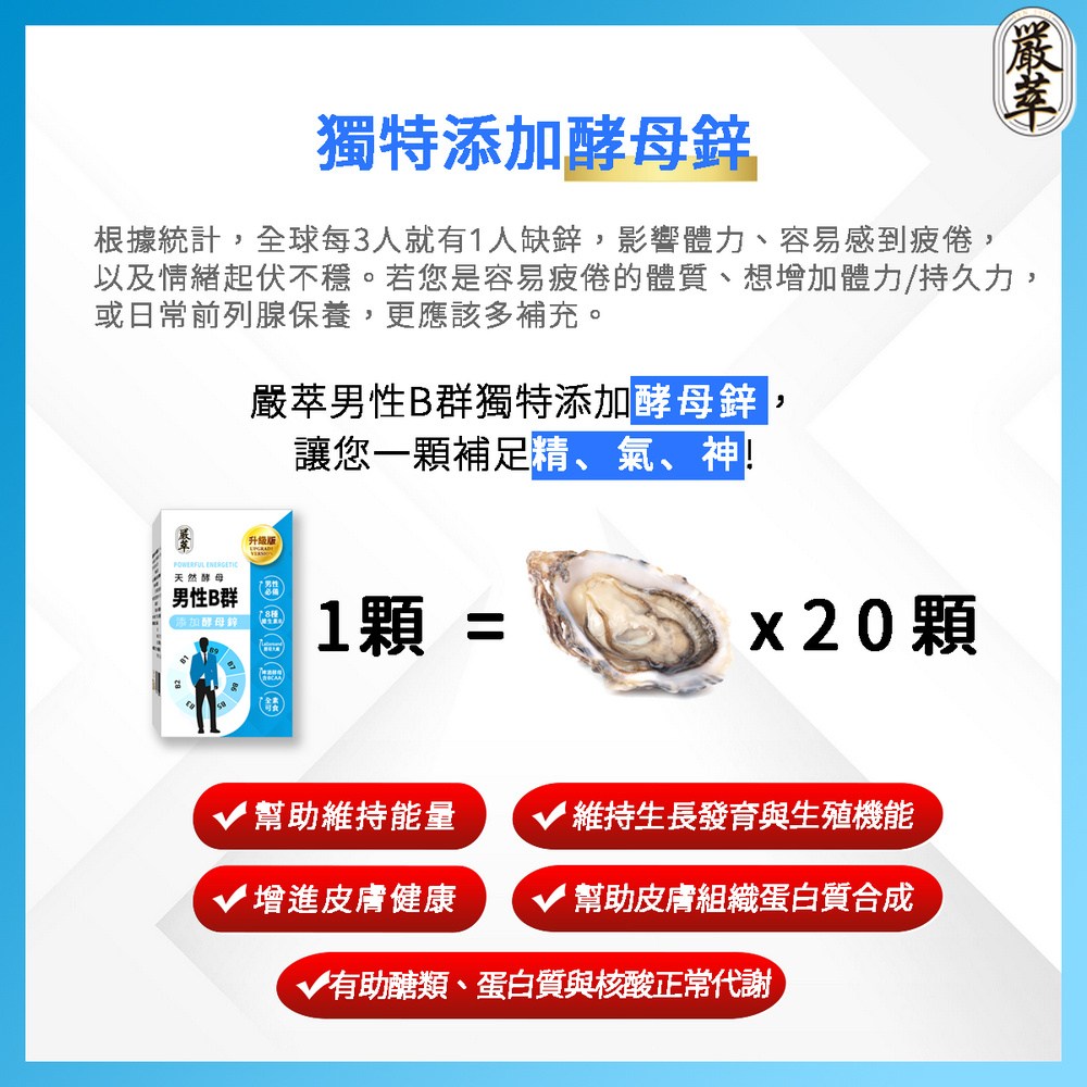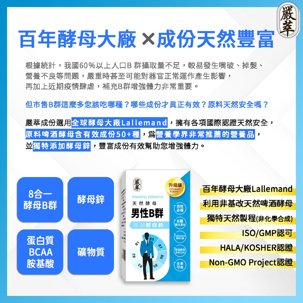 - 嚴萃男性B群提供全方位能量,讓您每天都充滿活力,告別疲勞,精神飽滿迎接挑戰。