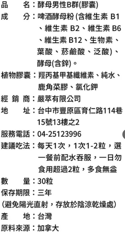 嚴萃男性B群,專為現代男性打造的活力補給品。每顆膠囊富含完整8種維生素B群,並獨特添加酵母鋅,有助於維持能量正常代謝,增強體力,讓您自信滿滿。本產品經ISO/GMP、HALA/KOSHER等多項國際認證,品質安全可靠。每日一粒,輕鬆補充所需營養,告別疲勞,展現最佳狀態。嚴萃男性B群,是您維持健康、提升活力的最佳選擇。