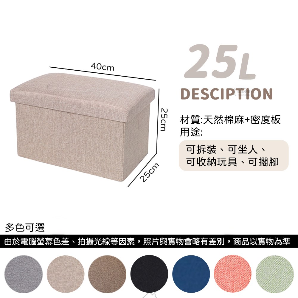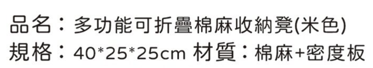 這款多功能可折疊棉麻收納凳,是您客廳的理想選擇。尺寸為40 x 25 x 25公分,米色外觀簡約時尚,能輕鬆融入各種居家風格。凳子採用棉麻布料與密度板製成,觸感舒適且堅固耐用。它不僅能作為座椅,座位高度25公分,提供舒適的坐感,還具備儲物空間,方便收納雜物,保持居家整潔。可折疊設計更便於收納,不佔空間。無論是放置於客廳、臥室或任何需要額外座位與儲物空間的角落,這款收納凳都能滿足您的需求。