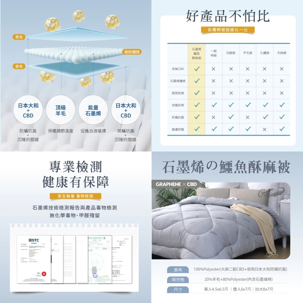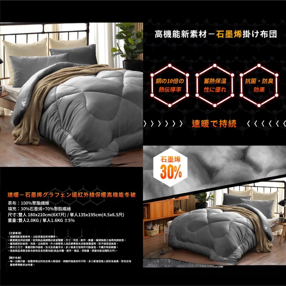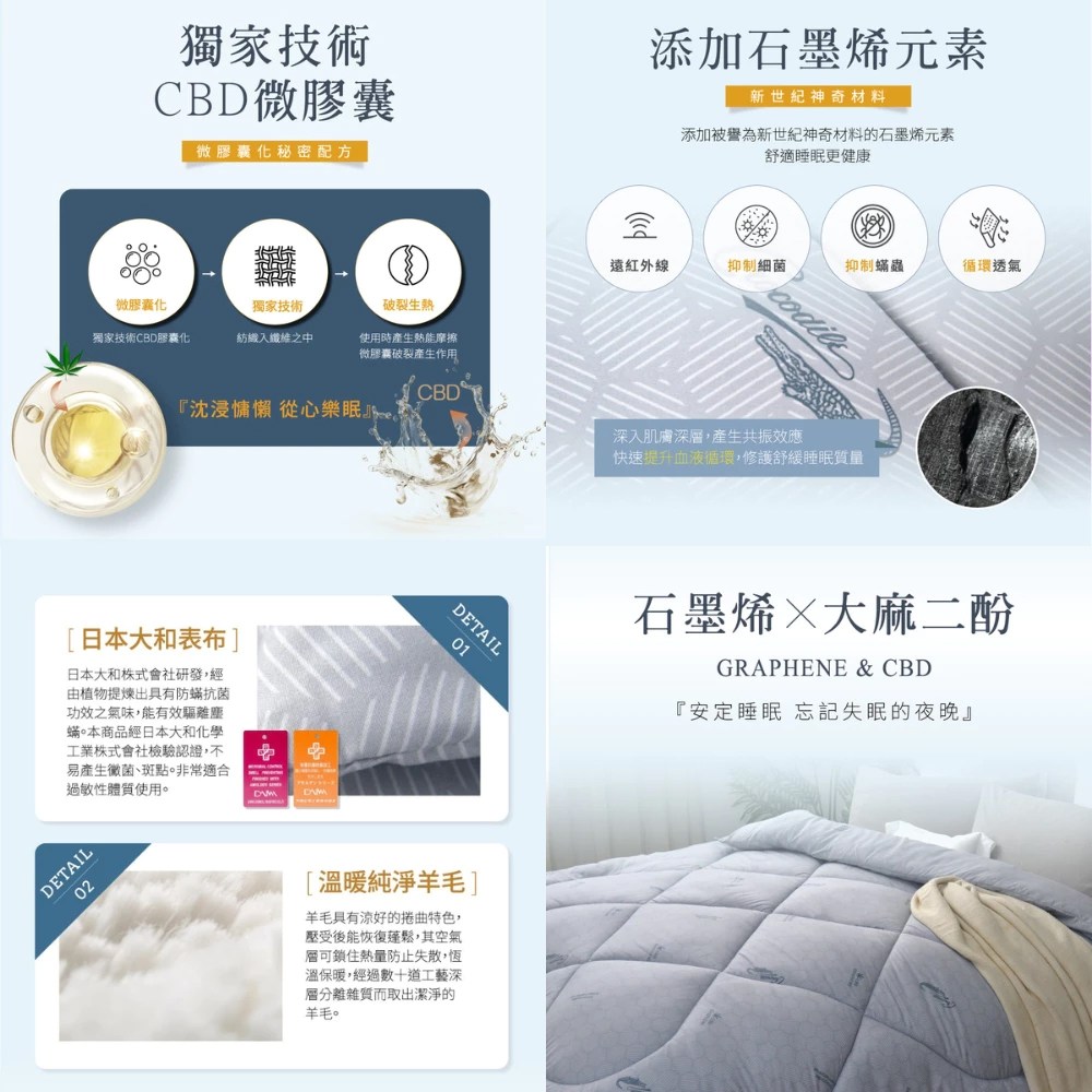 - 石墨烯纖維被,輕盈透氣,整夜舒適不悶熱,享受深度睡眠體驗。