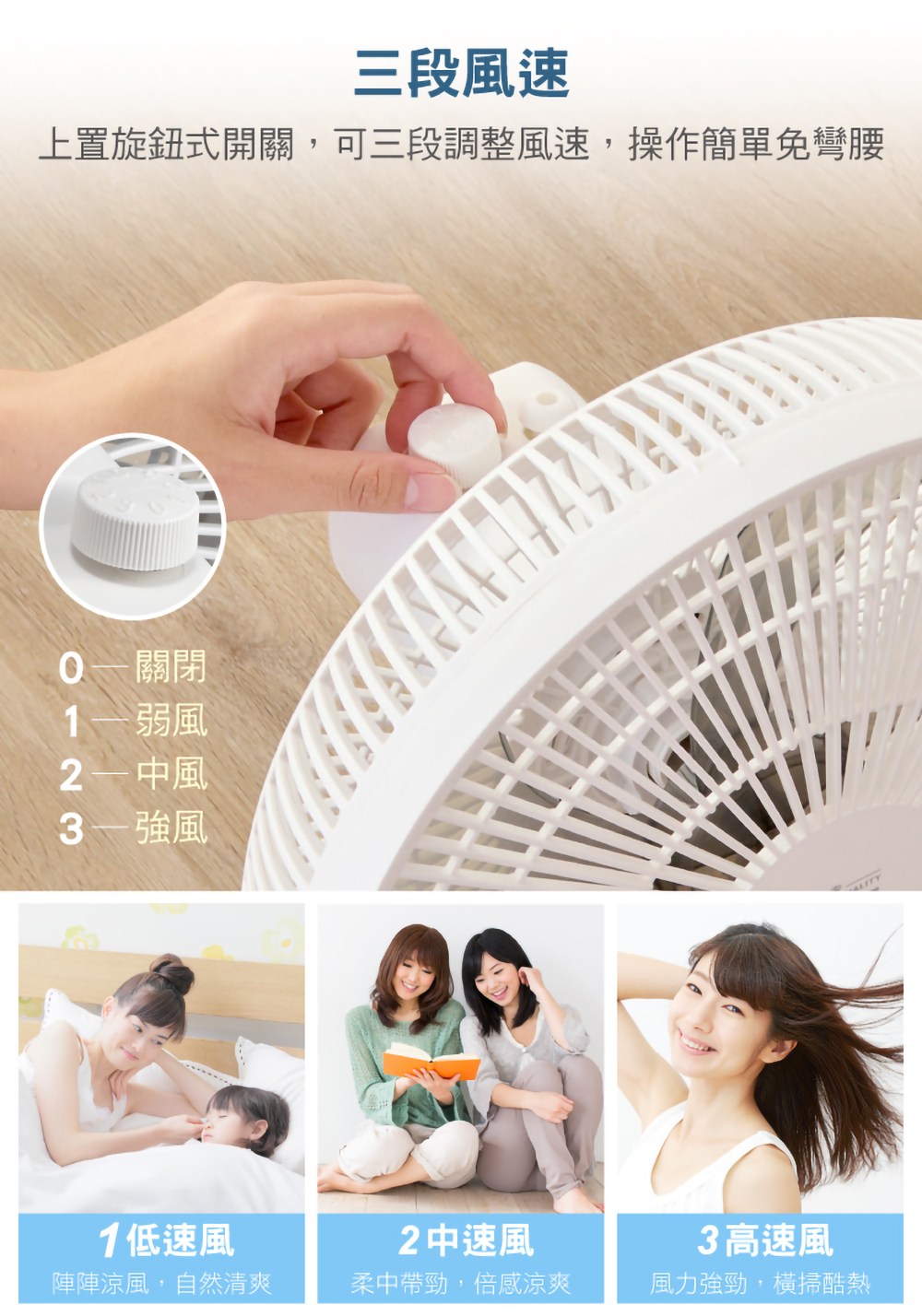- - 大家源立扇提供三段風速選擇,輕鬆調整至最舒適的風感,享受涼爽體驗。