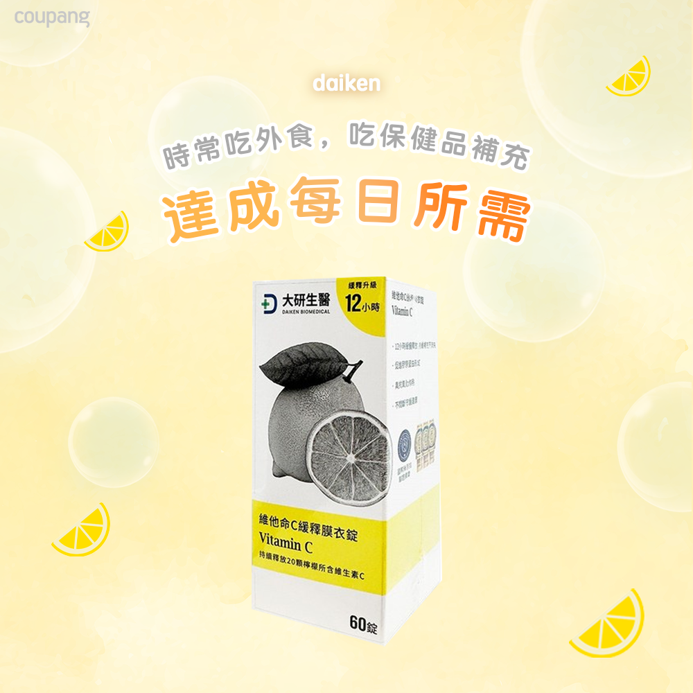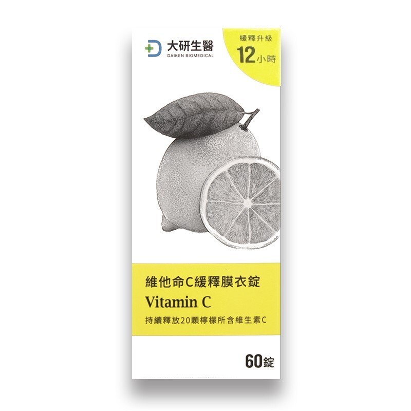 - 大研生醫維他命C,緩釋技術讓營養素慢慢釋放,維持體內維生素C的穩定濃度。