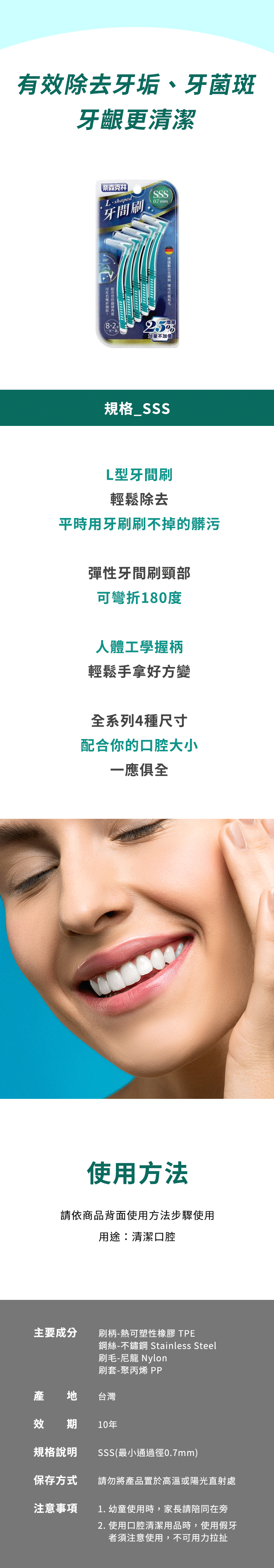- 0.7mm刷毛,適用於一般成人牙縫,溫和清潔不傷牙齦,使用體驗更舒適。