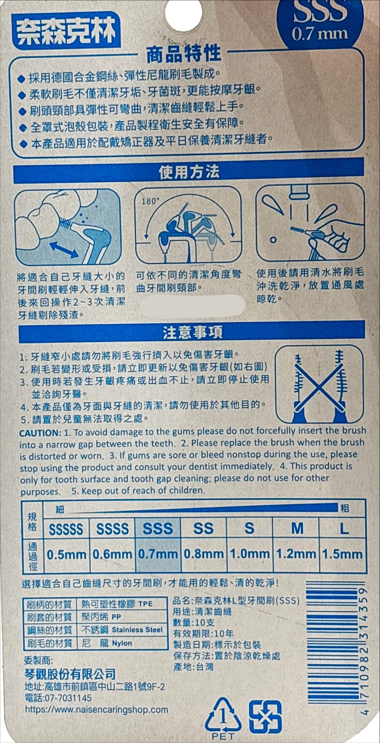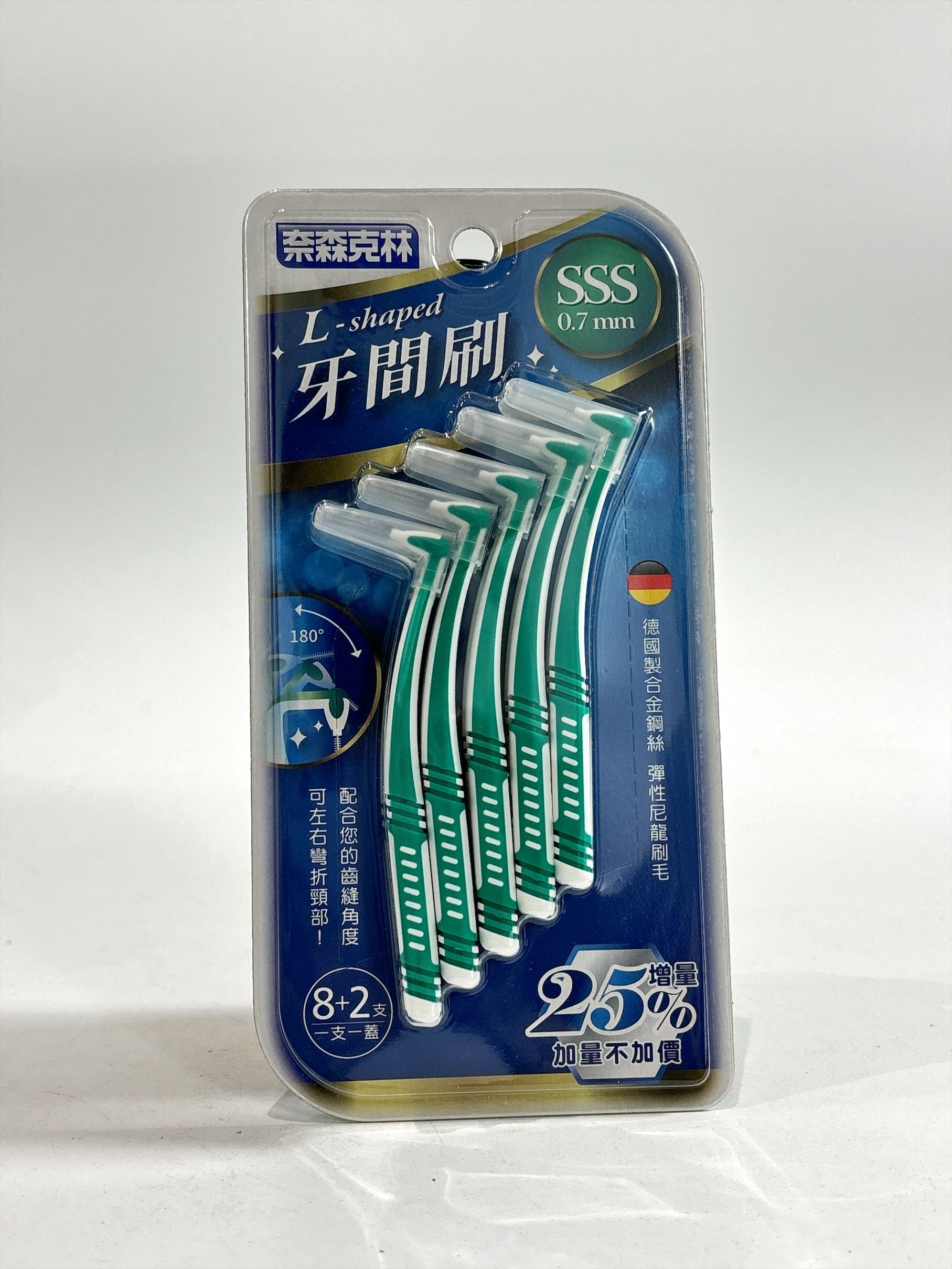 奈森克林 L 型牙間刷 SSS 0.7mm,為您提供更深層的口腔清潔。這款牙間刷採用德國進口合金鋼絲和彈性尼龍刷毛製成,確保耐用且溫和。刷頭頸部具備彈性,可靈活彎曲 180 度,輕鬆深入牙縫,有效清除牙垢和食物殘渣,按摩牙齦,特別適合矯正人士使用。每組包含 8+2 支牙間刷,尺寸為 SSS 0.7mm,適用於較小的牙縫,保持口腔健康。使用後請用清水沖洗乾淨,並放置於陰涼乾燥處。