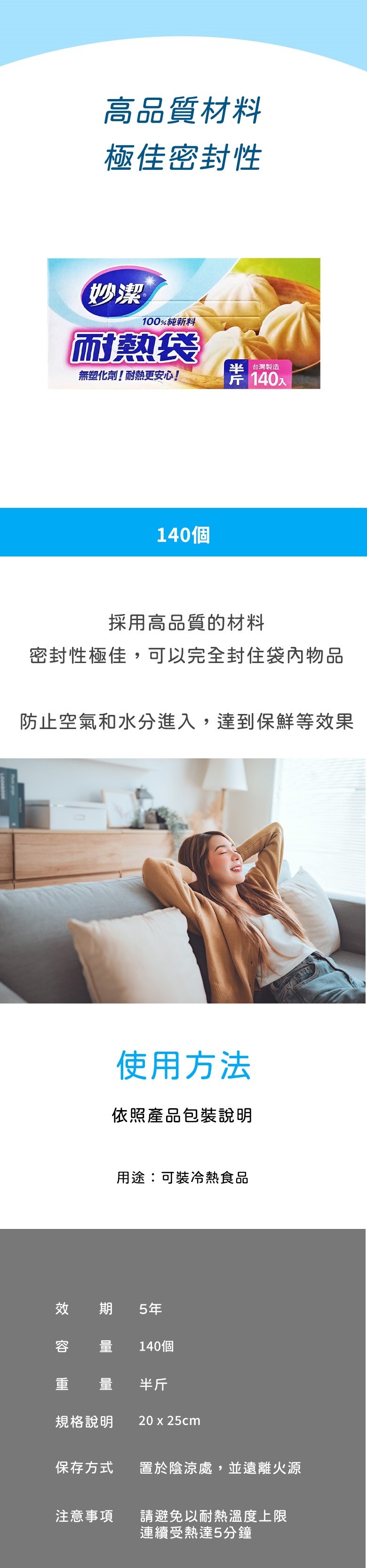 妙潔耐熱袋是您廚房裡不可或缺的好幫手。這款耐熱袋採用100%純新料製成,無塑化劑,讓您安心盛裝食物,即使是熱食也能放心使用。每盒包含140個半斤尺寸(20 x 25cm)的抽取型耐熱袋,方便您隨時取用。袋身強韌耐用,不易刺穿或破損,確保食物的新鮮與衛生。無論是冷藏或加熱,妙潔耐熱袋都能為您提供最佳的保護。