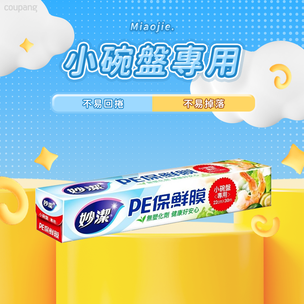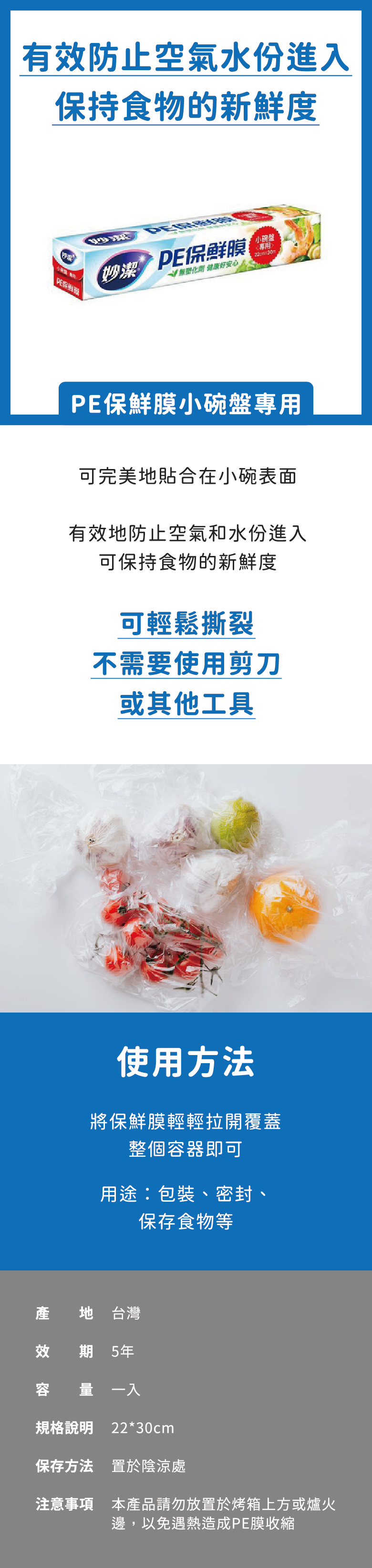 妙潔 PE 保鮮膜專為小碗盤設計,尺寸為 22cm x 30m,一盒裝。採用 PE 材質,不含塑化劑,讓您使用更安心健康,保持食物新鮮度,非常適合家庭使用。其易撕裂設計,無需剪刀或其他工具,使用方便快捷。包裝盒上附有撕取指示,讓您輕鬆抽取保鮮膜,中間檔板專利設計,抽取更順暢。