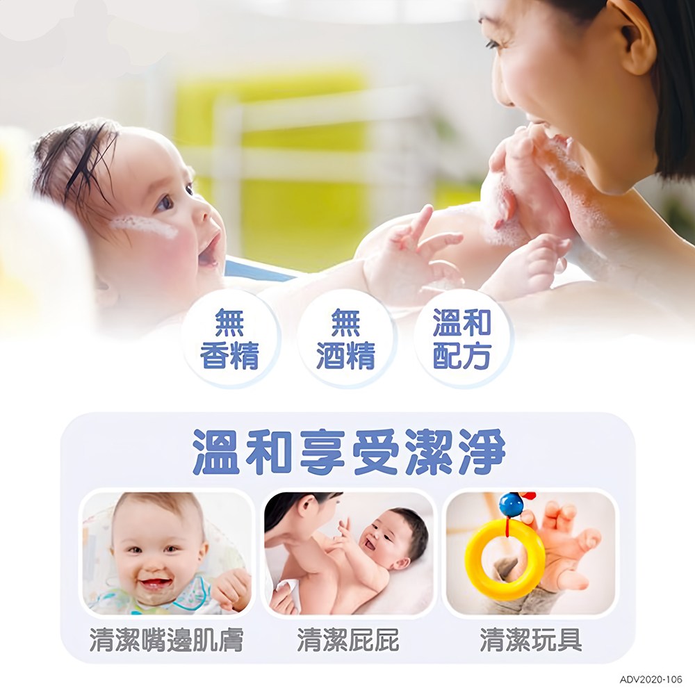 - 純水配方,無酒精、無香精,溫和不刺激,讓寶寶遠離過敏,媽媽更安心。