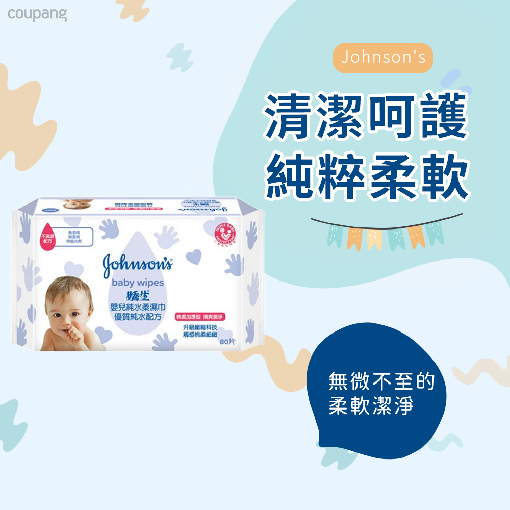 Johnson's 嬌生嬰兒純水柔濕巾,棉柔加厚型,呵護寶寶嬌嫩肌膚。本產品採用優質純水配方,不含酒精、香精及螢光劑,溫和不刺激,給寶寶最安心的呵護。棉柔加厚設計,觸感細緻柔軟,清潔力更佳,讓寶寶隨時保持乾淨清爽。每包含80張,3包入,方便攜帶,隨時隨地呵護寶寶。