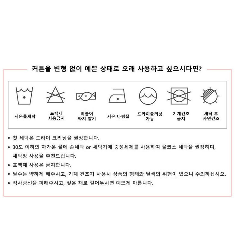 下擺加長設計,讓您不用擔心光線從縫隙透入。這款窗簾有多種顏色可選,從清新明亮的色調到沉穩優雅的色系,都能滿足您的需求,輕鬆搭配各種居家風格,營造溫馨舒適的居家氛圍。之後清洗時,請使用30度以下的冷水,並選擇中性洗滌劑以手洗或放入洗衣袋中以「羊毛」模式機洗。洗滌後,請輕輕擰乾水分,並避免陽光直射,自然晾乾即可。