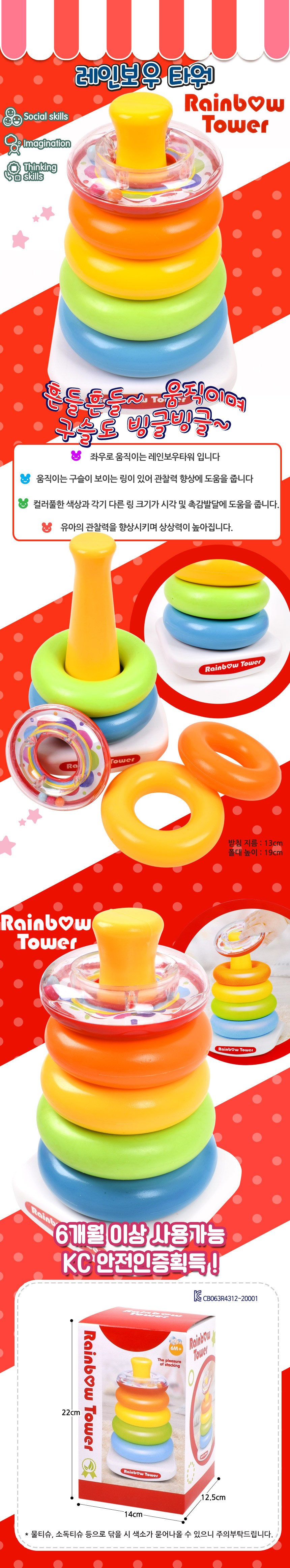 色彩繽紛的彩虹疊疊樂,搖一搖會左右晃動,內含會移動的小珠子,激發寶寶的好奇心。多種顏色與尺寸的環,有助於寶寶辨識顏色和大小,並從遊戲中學習空間概念。