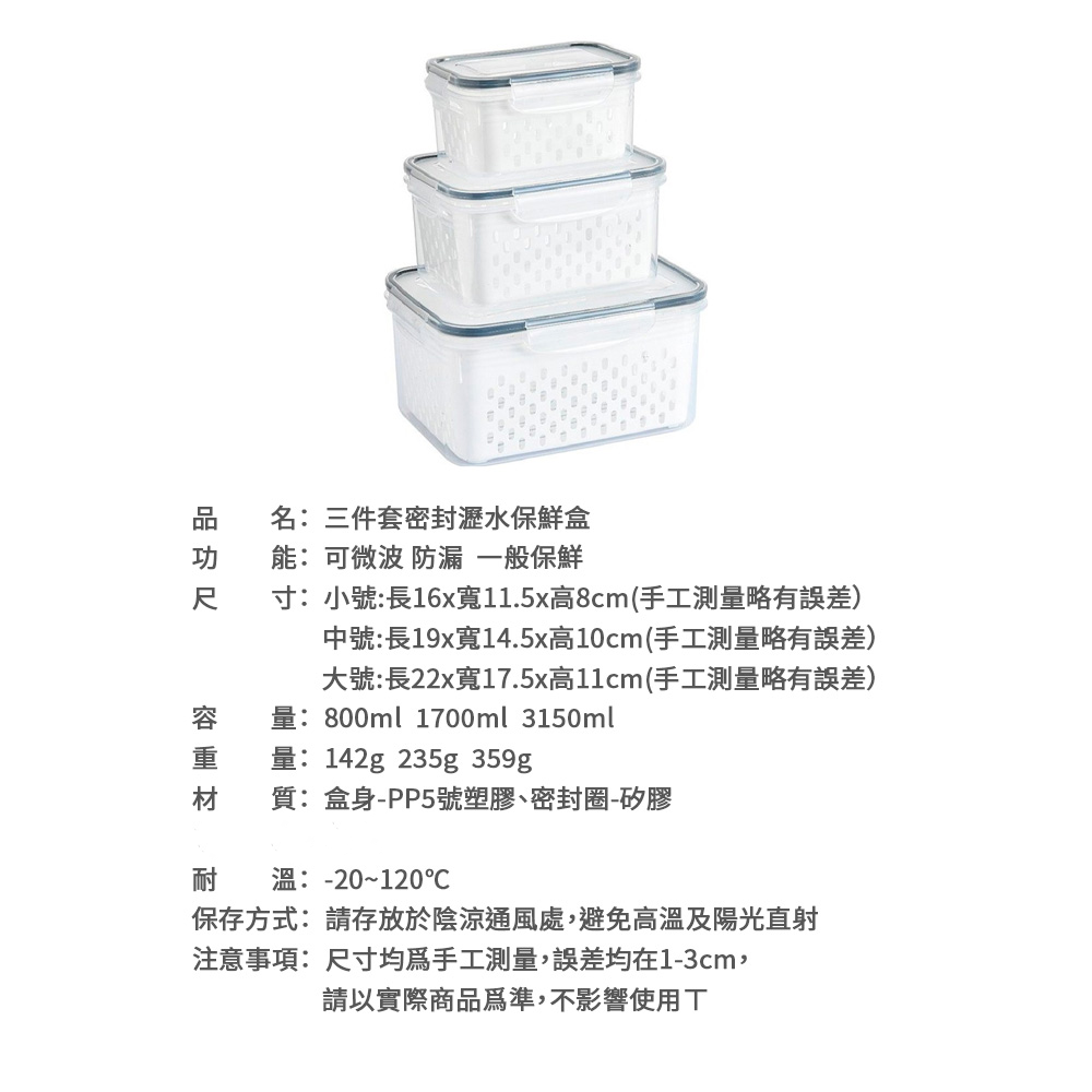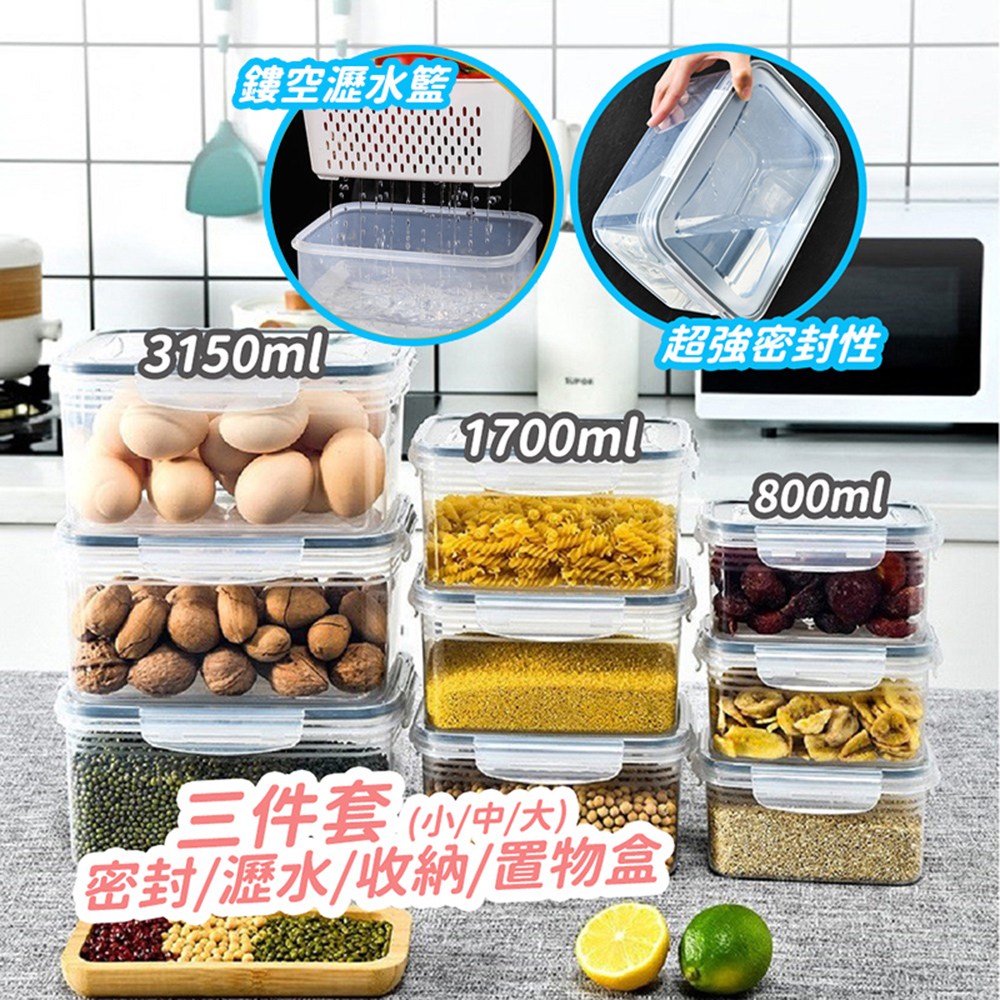 這款三件套密封瀝水保鮮盒是您廚房收納的理想選擇。套裝包含小號(800ml)、中號(1.7L)和大號(3150ml)三種尺寸,滿足您不同的儲物需求。採用優質PP5塑料製成,讓您安心儲存各類食材,延長保鮮期,瀝水功能則能保持蔬果乾爽。無論是存放水果、蔬菜還是剩菜,這款保鮮盒都能讓您的冰箱井井有條,告別異味。